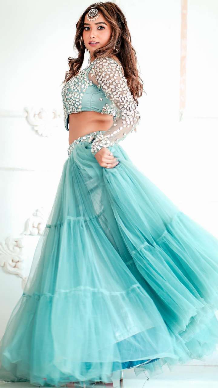 ब्लू कलर का यह लहंगा शादी फंक्शन के लिए बेहद बेस्ट ऑप्शन हैं। लड़कियां इस लहंगे के साथ न्यूड मेकअप ट्राई कर सकती हैं साथ ही हैवी इयररिंग्स और मांग टिक्का लहंगे के लुक में चार चांद लगा देगा।