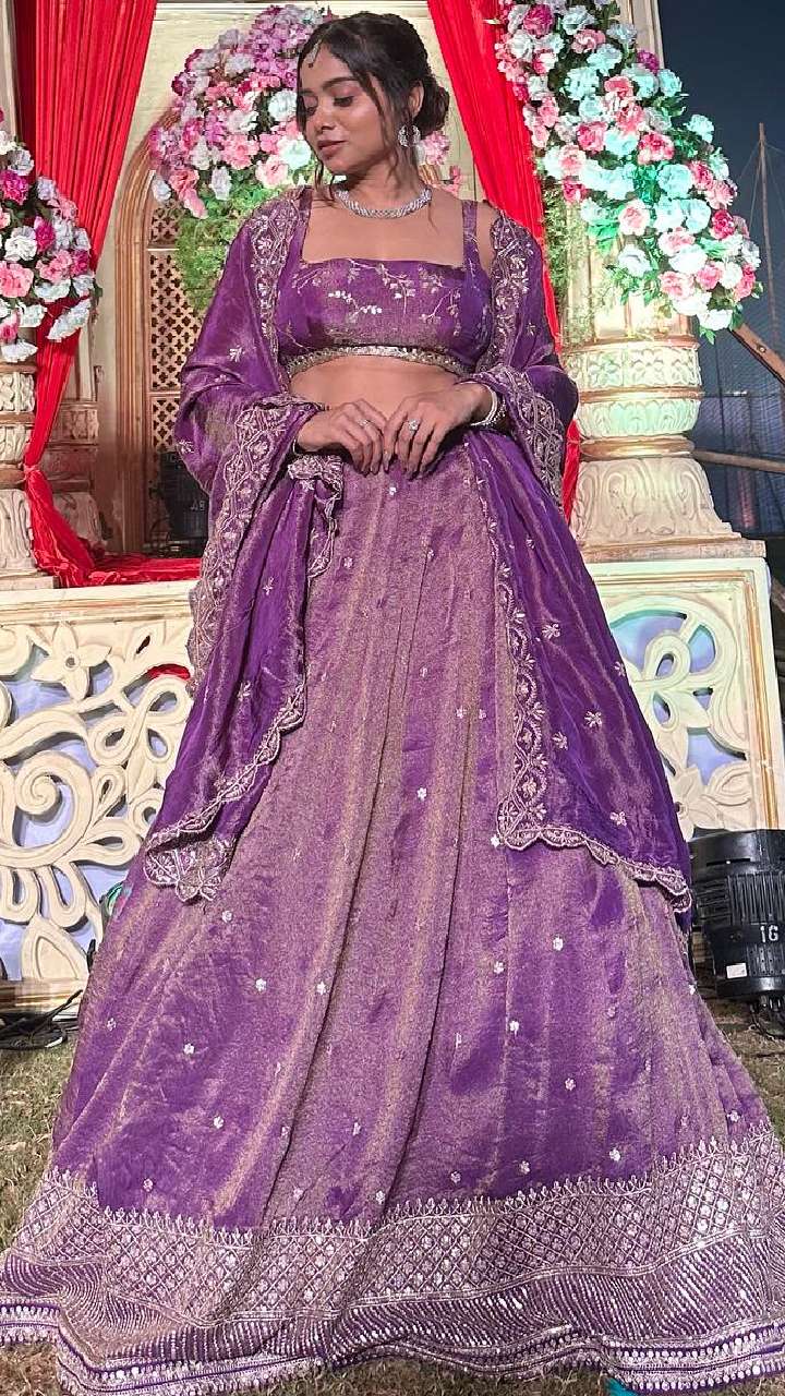 एक्ट्रेस का पर्पल कलर का लहंगा काफी सुंदर लग रहा हैं। सर्दियों की शादी में आप इस लहंगे को पहन सकती हैं। यंग गर्ल्स इस लहंगे के साथ कर्ली हेयर स्टाइल बना सकती हैं।