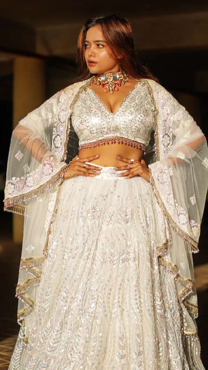 डीवा व्हाइट कलर के लहंगे संग डीप वी नेक ब्लाउज में काफी स्मार्ट लग रही हैं। हैवी ब्रेस्ट के लिए ये डिजाइन बेस्ट है।