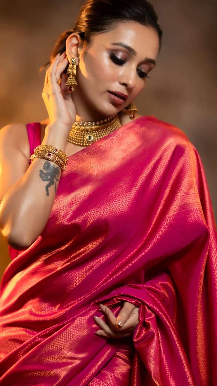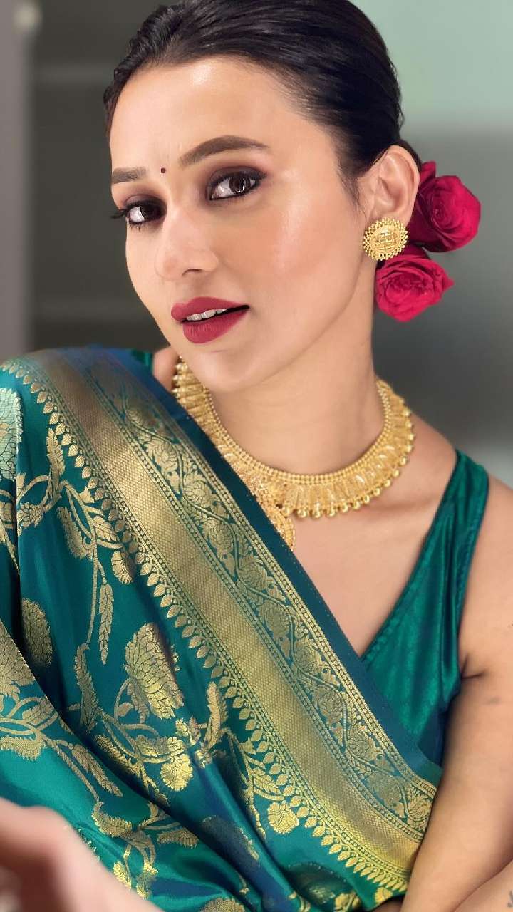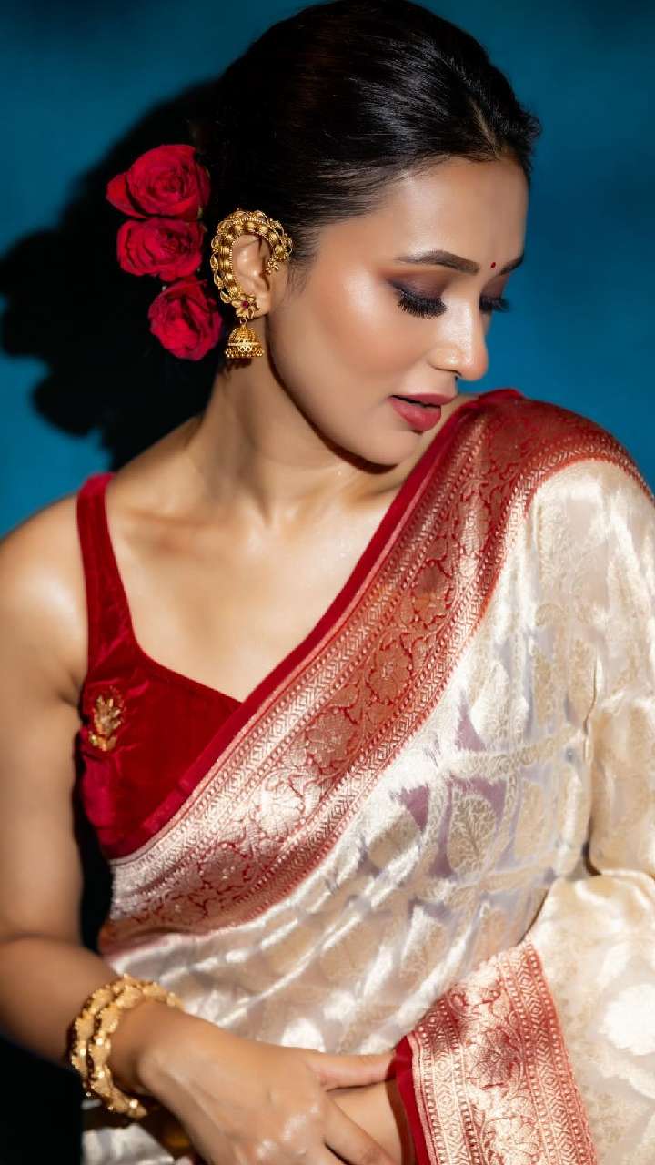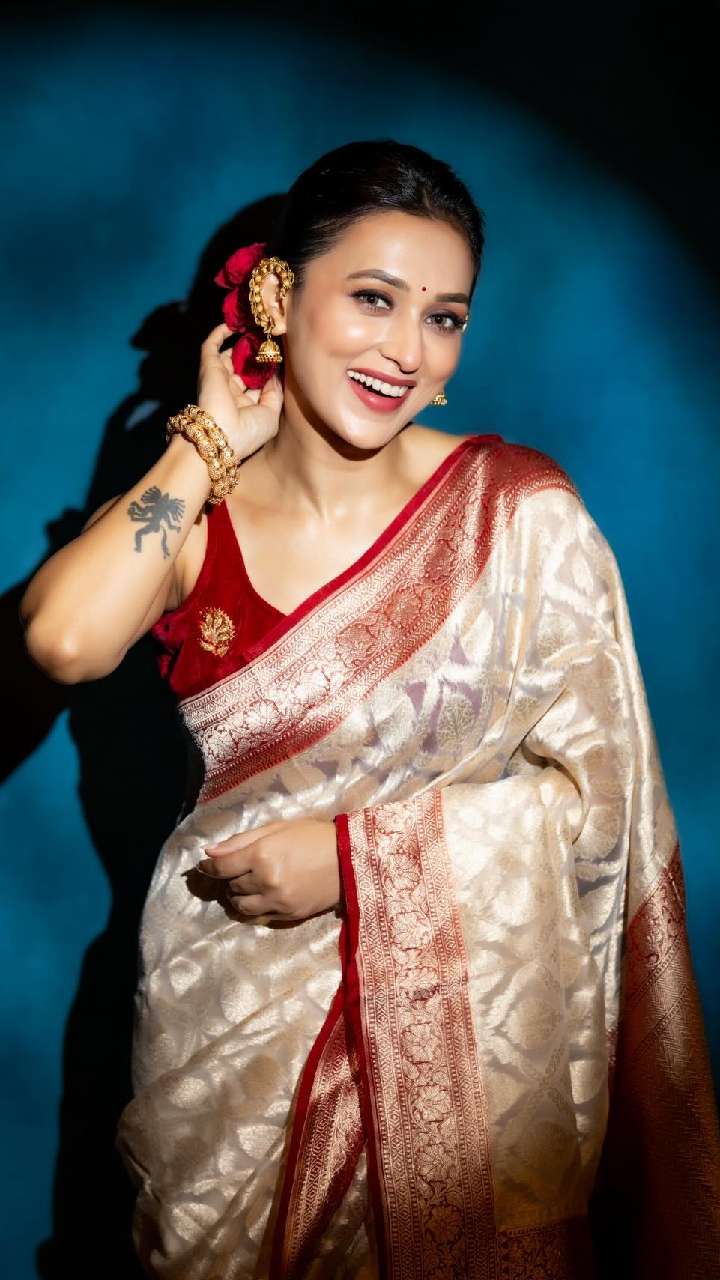 ब्यूटीफुल सिल्क साड़ी के साथ मिमी चक्रवर्ती ने बालों में गुलाब का गजरा लगाया है। आप भी जुड़ा बना कर गजरा जरूर लगाएं।