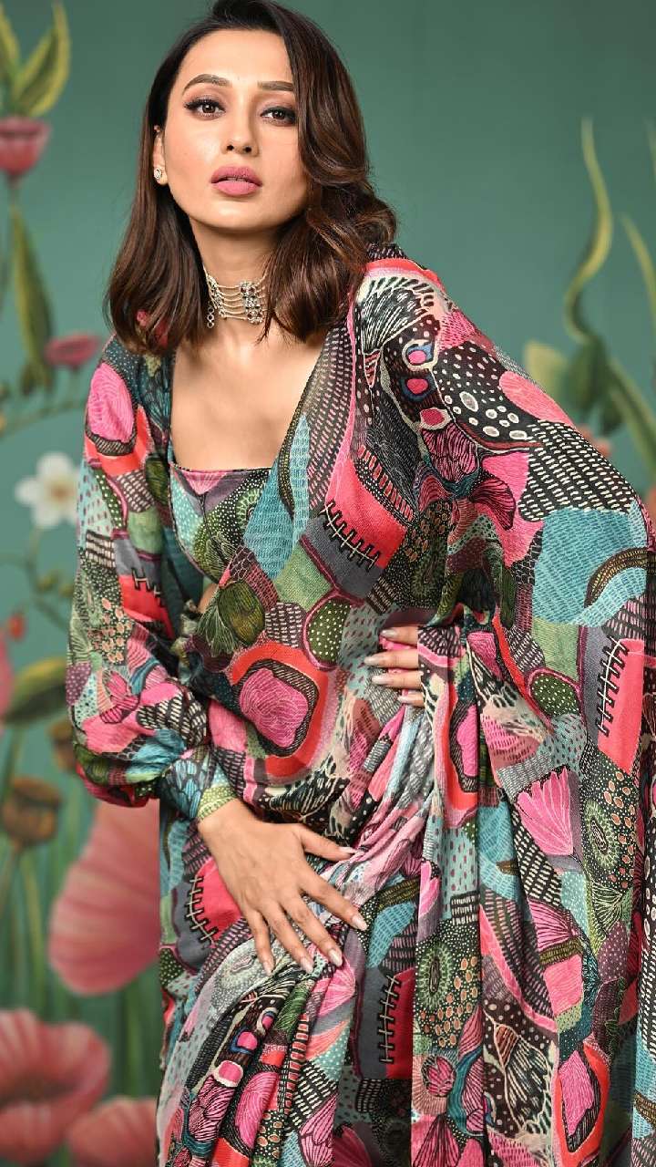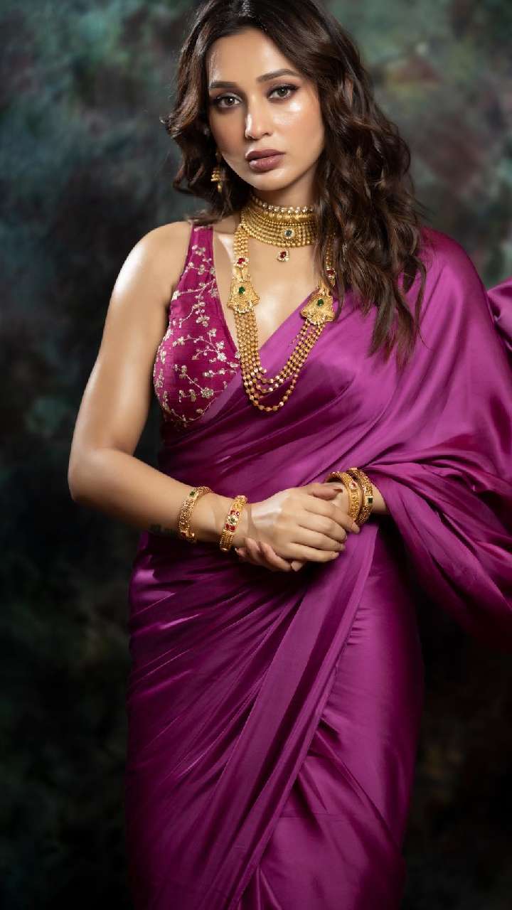 मिमी का पिंक स्ट्रैप प्रिंट साटन प्लेन साड़ी कंट्रास्ट व्हाइट कट स्लीव्स ब्लाउज लुक बेहद हॉट लग रहा है।