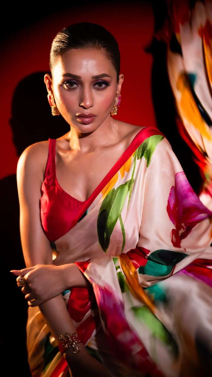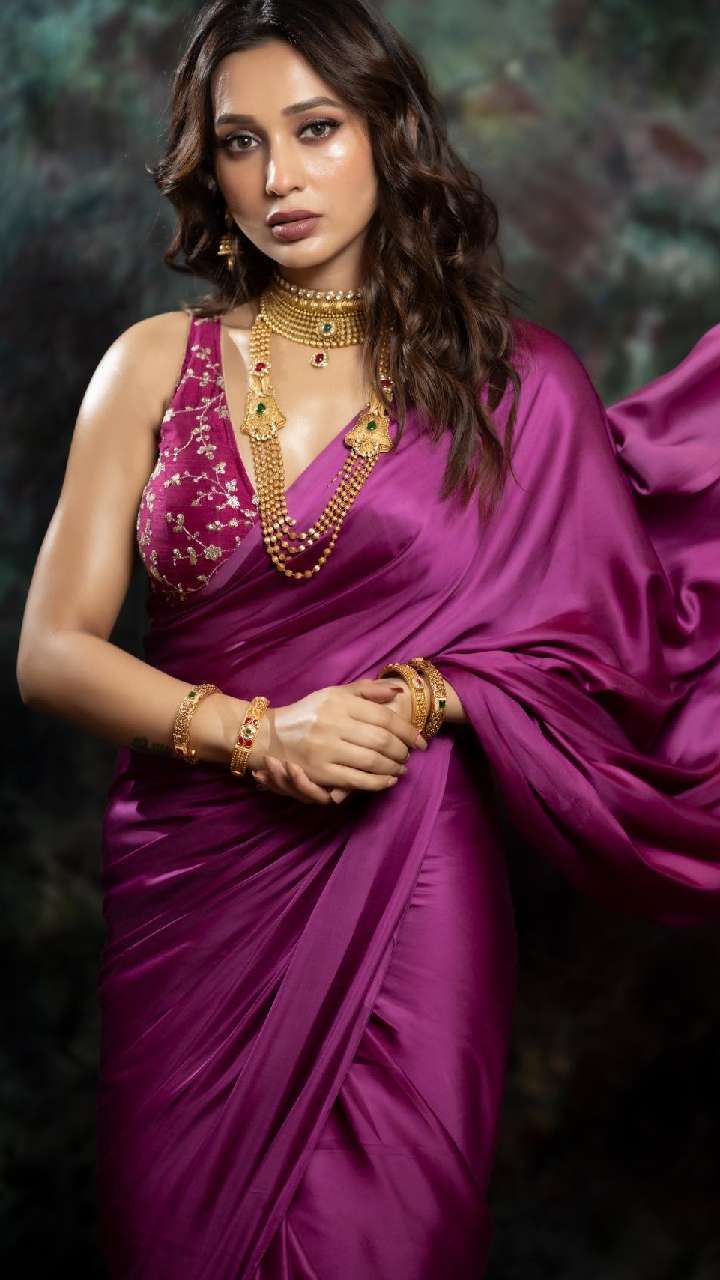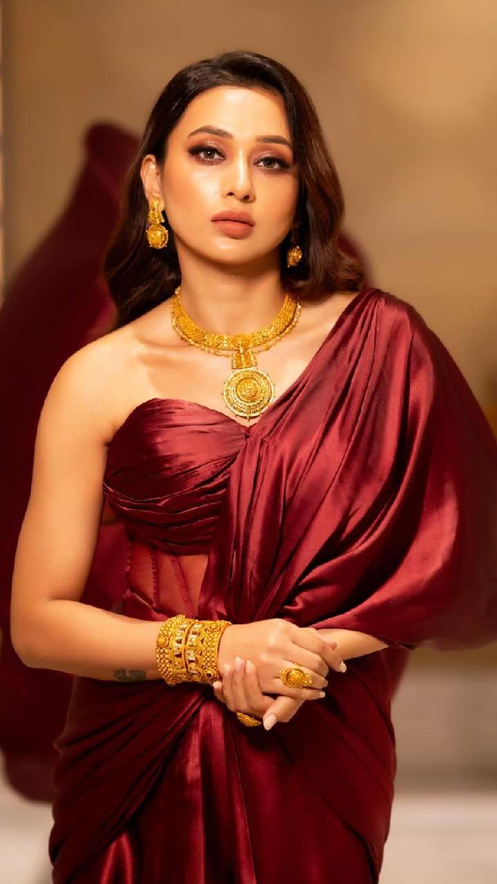मिमी मरून कलर की साटन साड़ी ऑफ शोल्डर ब्लाउज में गॉर्जियस लग रही हैं। ये आपके दुर्गा पूजा के लिए बेस्ट चॉइस है।
