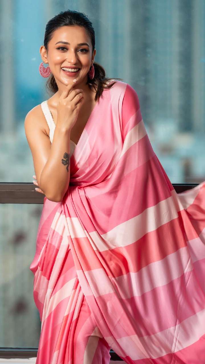 अभिनेत्री पिंक कलर की प्लेन साटन साड़ी स्लीवलेस ब्लाउज में बला की खूबसूरत लग रही हैं। इसके साथ उन्होंने गोल्डन ज्वैलरी पेयर की हुई है।