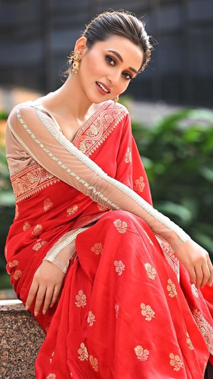 डीवा इस रेड कॉटन साड़ी और फुल स्लीव्स ब्लाउज संग बन हेयर स्टाइल में बेहद प्रिटी दिख रही हैं।