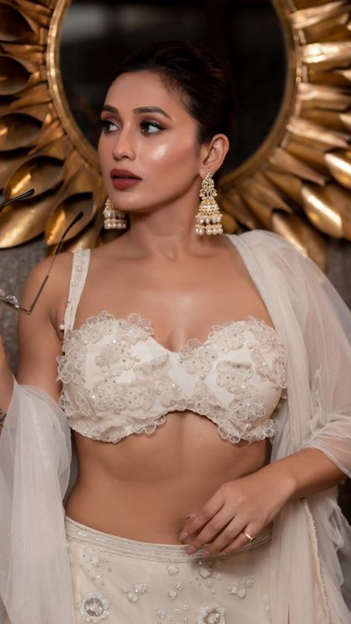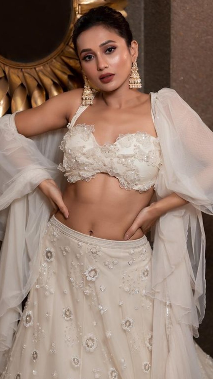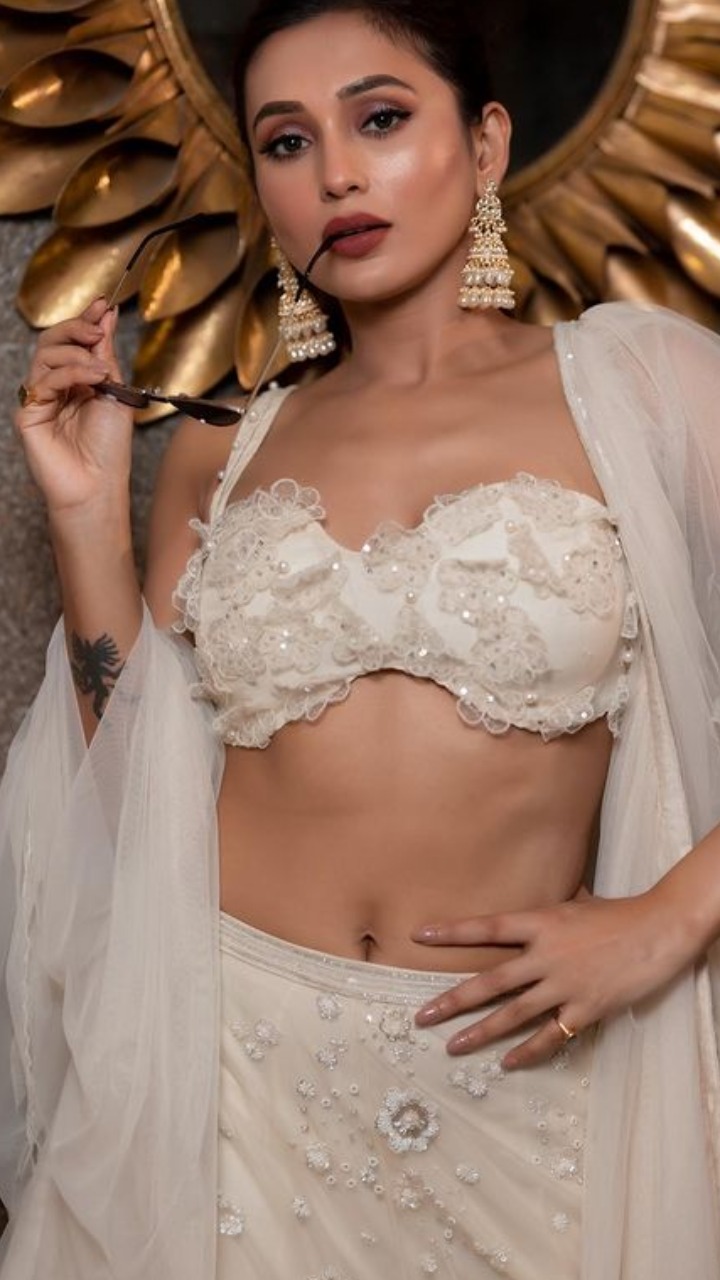 मिमी चाक्रवार्ती ने व्हाइट लहंगे को कैरी किया हैं। एक्ट्रेस इस लहंगे में बेहद हॉट दिख रही हैं।