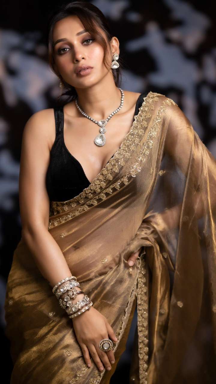 मिमी चक्रवर्ती इस गोल्डन साड़ी में अदाओं से सभी को मदहोश करती नजर आ रही हैं। एक्ट्रेस ने ब्लैक ब्लाउज पेयर किया है, जो लुक को स्पेशल बना रहा है।