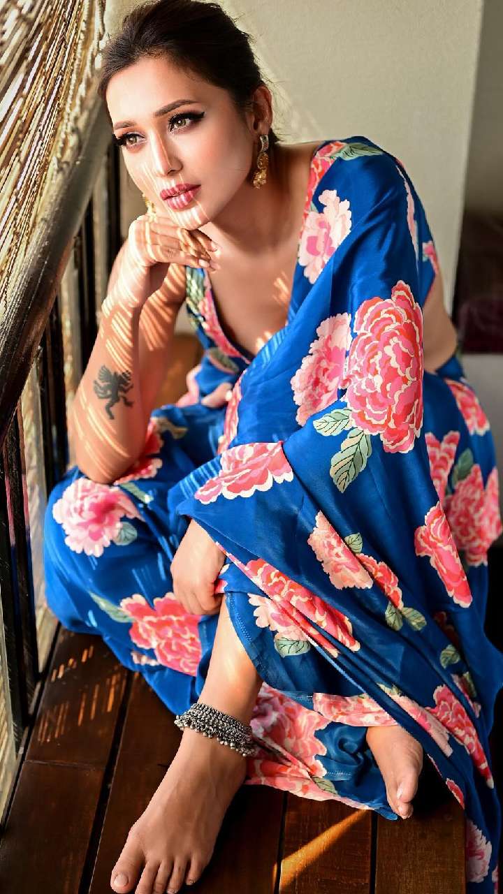 गर्मियों के दिनों में कॉटन साड़ी कैरी करना सबसे बेहतरीन विकल्प है। नीले रंग की फूल प्रिंट साड़ी में मिमी बला की खूबसूरत लग रही हैं। आप भी उनकी लुक से आइडिया ले सकती हैं।