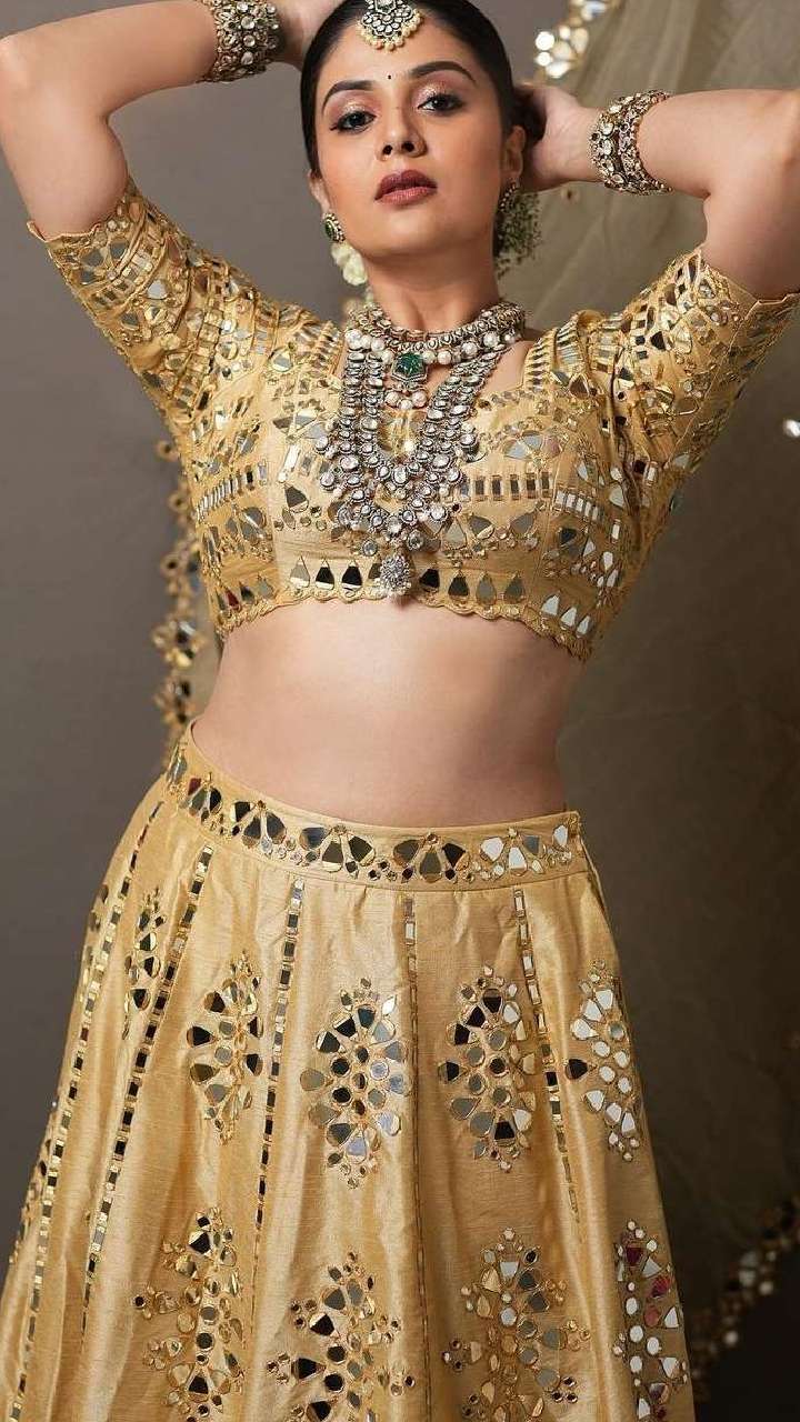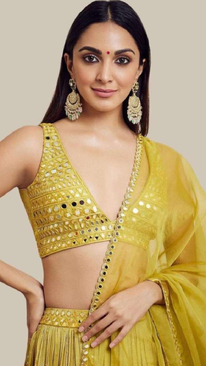 स्टाइलिश और ग्लैमरस लुक पाने के लिए एक्ट्रेस का यह मिरर वर्क ब्लाउज का डिजाइन एकदम परफेक्ट है। यह शादी में आपको स्पॉट लाइट बनाने का काम करेगा।