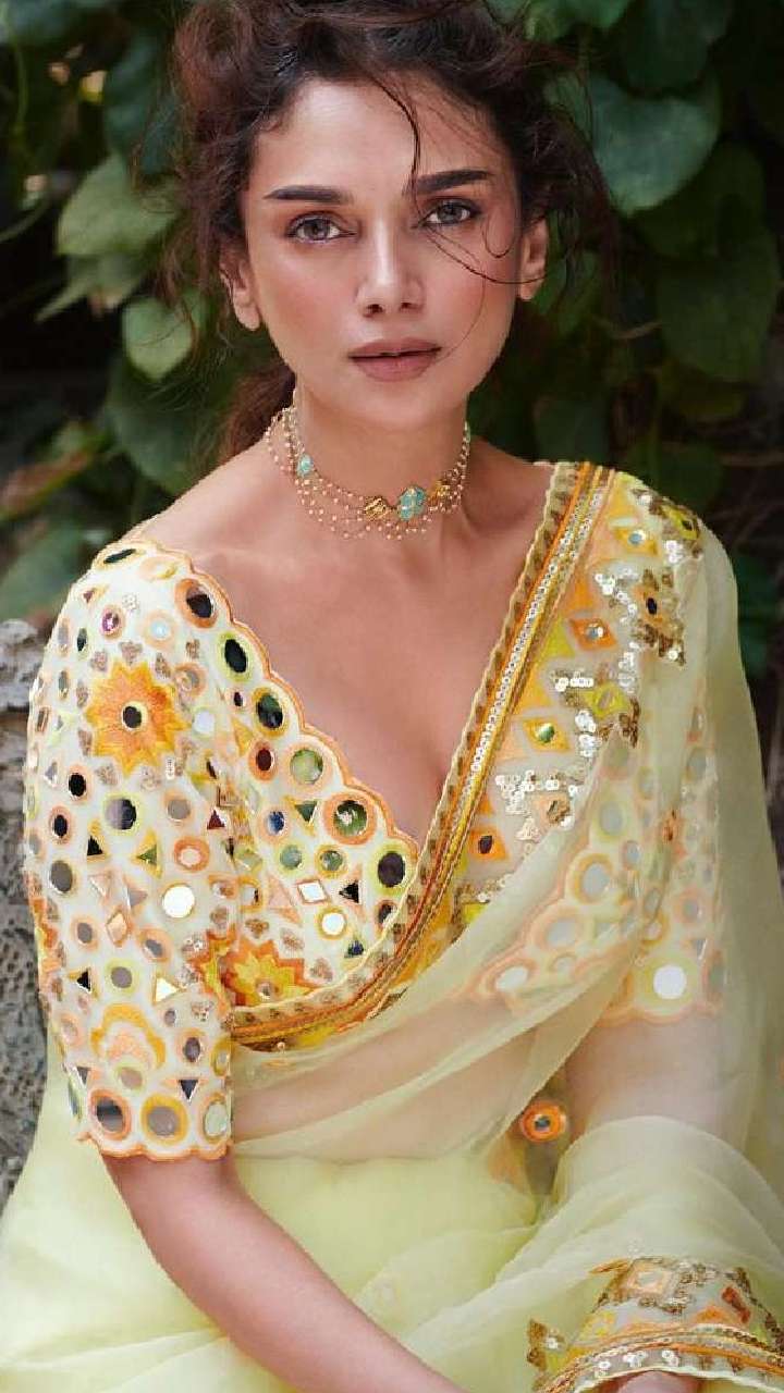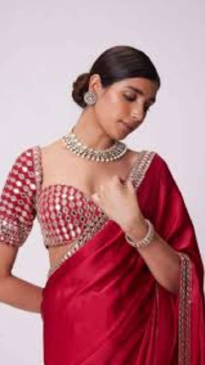 अगर आप पार्टी में रॉयल साड़ी के साथ ग्लैमरस लुक लेने का सोच रही हैं, तो एक्ट्रेस का यह मिरर वर्क वाला वी नेक ब्लाउज एकदम परफेक्ट ऑप्शन है।