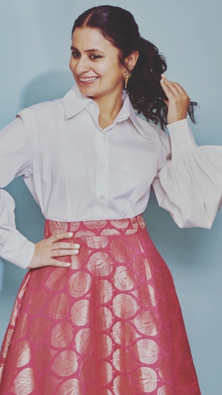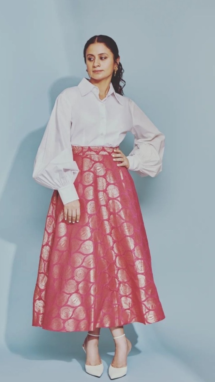 इस सफेद शर्ट संग चमकीली पिंक स्कर्ट में एक्ट्रेस का स्टाइलिश अंदाज लाजवाब है।
