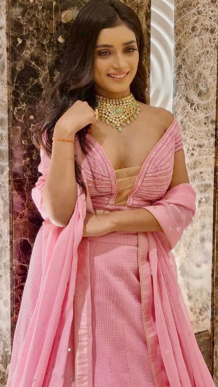 आप चाहे तो इस तरह से पिंक लहंगे से भी अपनी खूबसूरती में चार चांद लगा सकती हैं। इसके साथ एक्ट्रेस की ऑफ शोल्डर चोली कहर ढहा रही है।