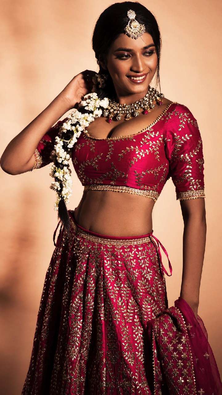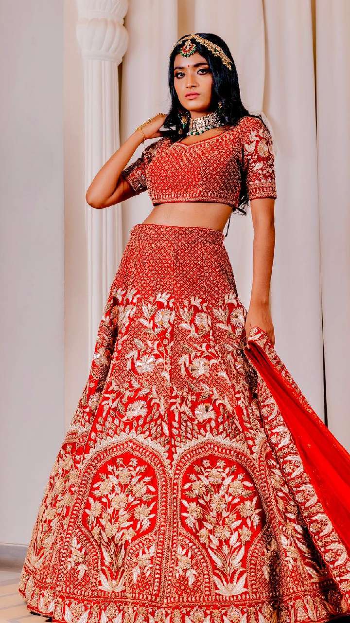 इस वेडिंग सीजन ब्राइडल मान्या के इस रेड हेवी वर्क लहंगे स्वीट हार्ट लुक को फॉलो कर सकती हैं।