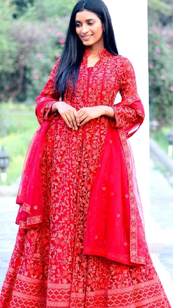 मान्या इस रेड अनारकली हेवी वर्क सूट में बिल्कुल वेडिंग गेस्ट लुक दे रही हैं। आप इस लुक को कॉपी कर सकते हैं।