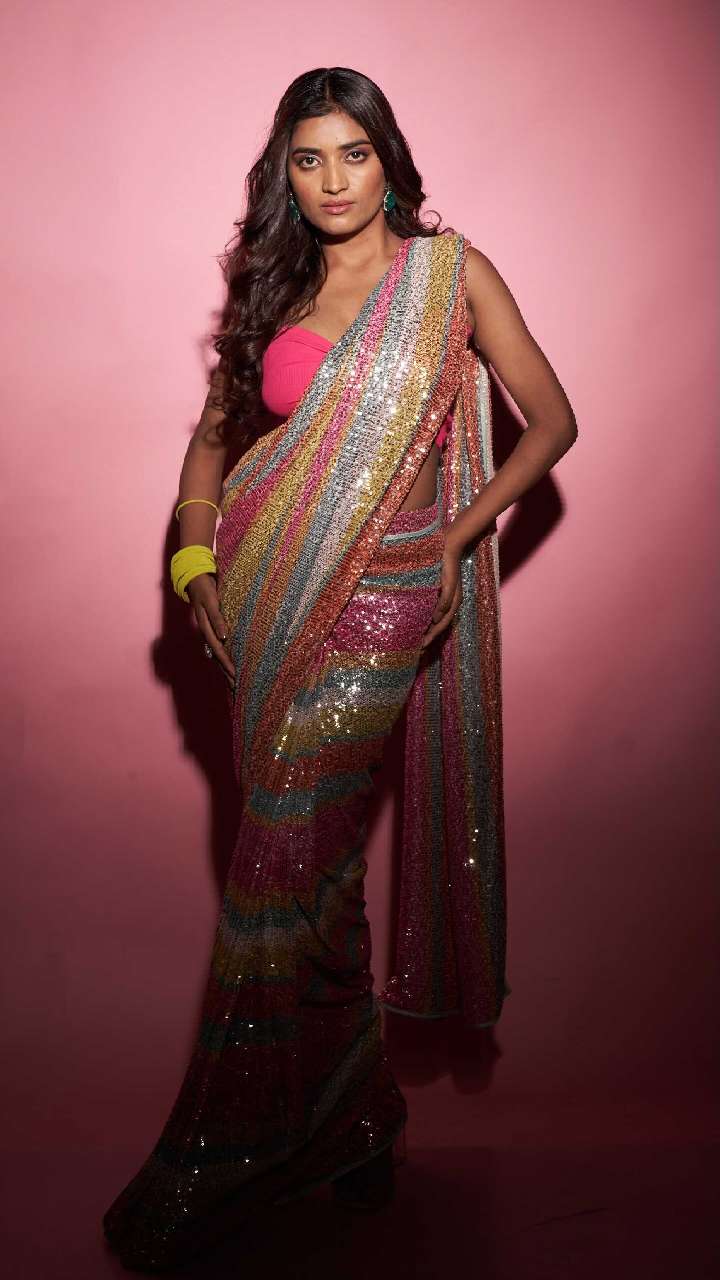 मान्या सिंह का मल्टीकलर सेक्विन साड़ी पिंक कट स्लीव्स ब्लाउज लुक बेहद हॉट लग रहा है। कर्वी फिगर पर डीवा का ये लुक काफी सूट करेगा।