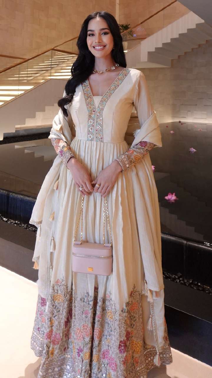 मिस वर्ल्ड सूट में भी शानदार दिखाई देती हैं। उन्होंने अनारकली सूट के साथ बालों को खुला ही रखा है।