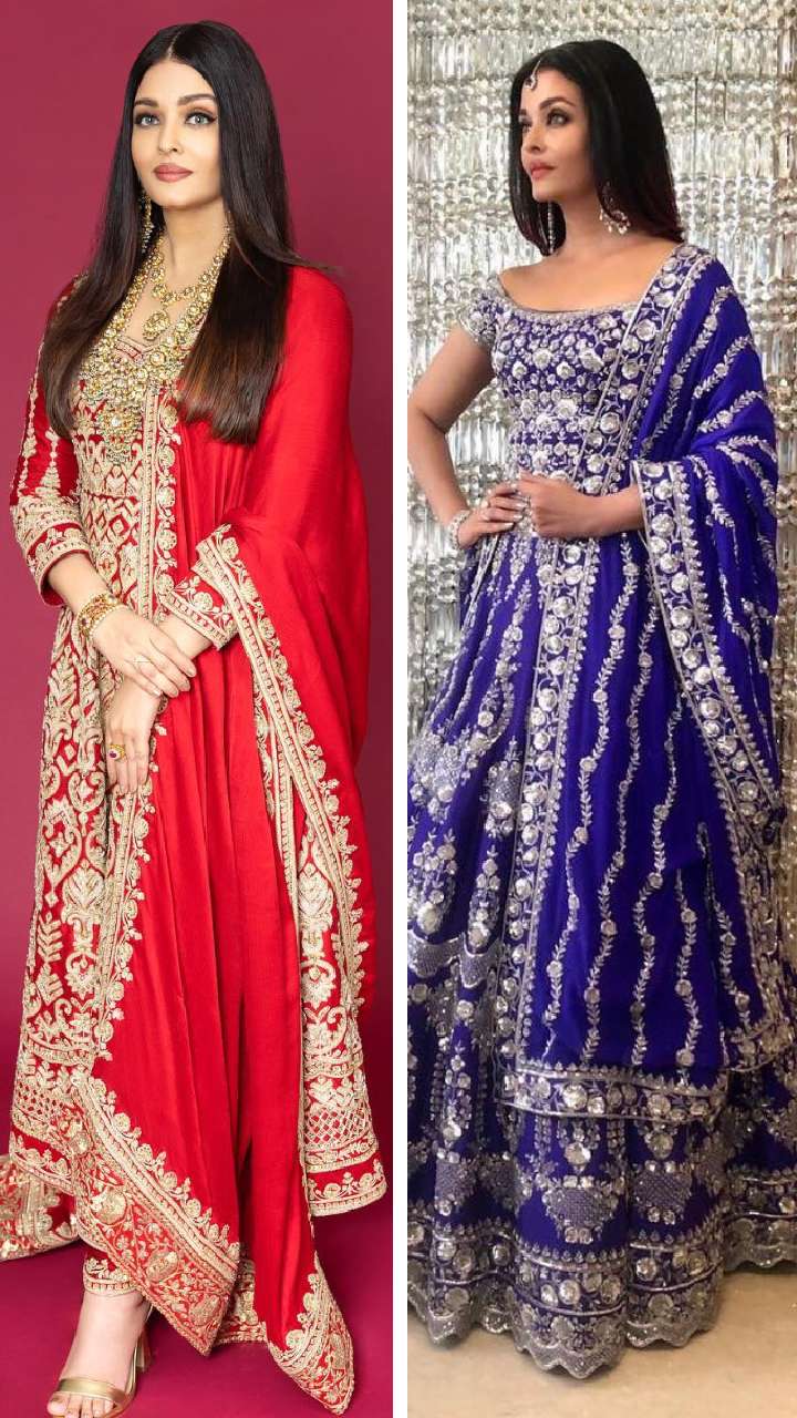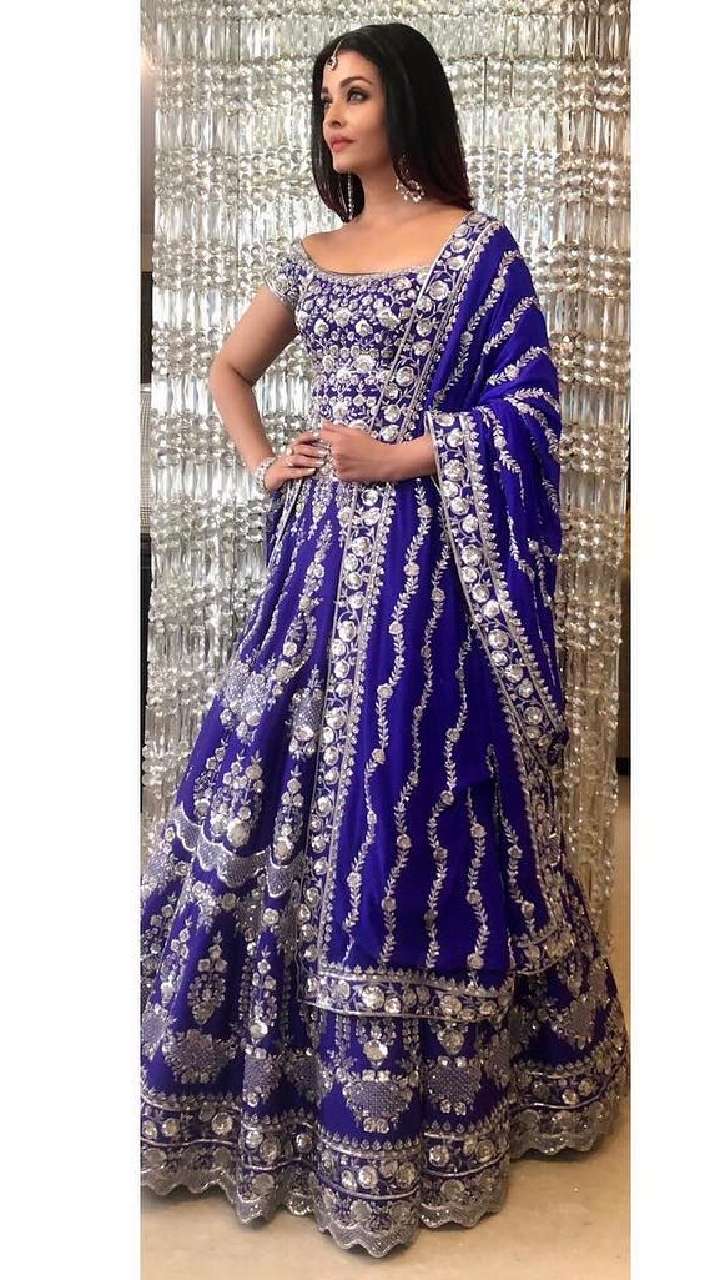 इस दिवाली ऐश्वर्या का ब्लू हेवी वर्क लहंगा मांग टीका लांग इयररिंग लुक अच्छा ऑप्शन है।