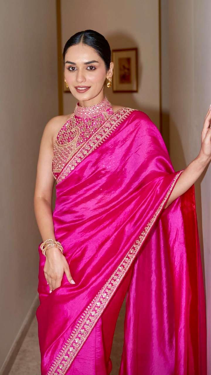 अभिनेत्री का पिंक सिल्क साड़ी जीरो नेक हैवी वर्क ब्लाउज काफी गॉर्जियस लग रहा है। आजकल ऐसी सिंपल साड़ियां काफी ट्रेंड में हैं।