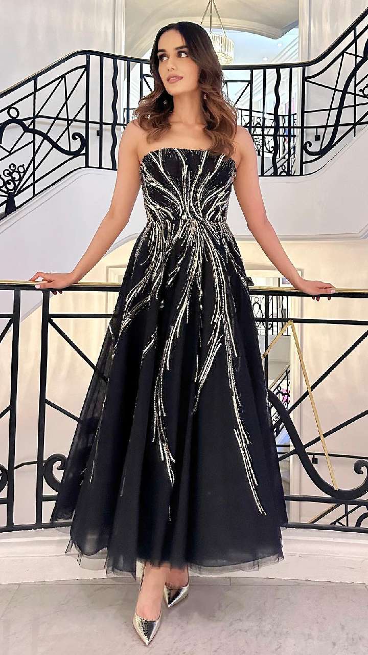 मानुषी का ब्लैक वेलवेट गाउन विद पफ स्लीव्स काफी गॉर्जियस लुक दे रही हैं।