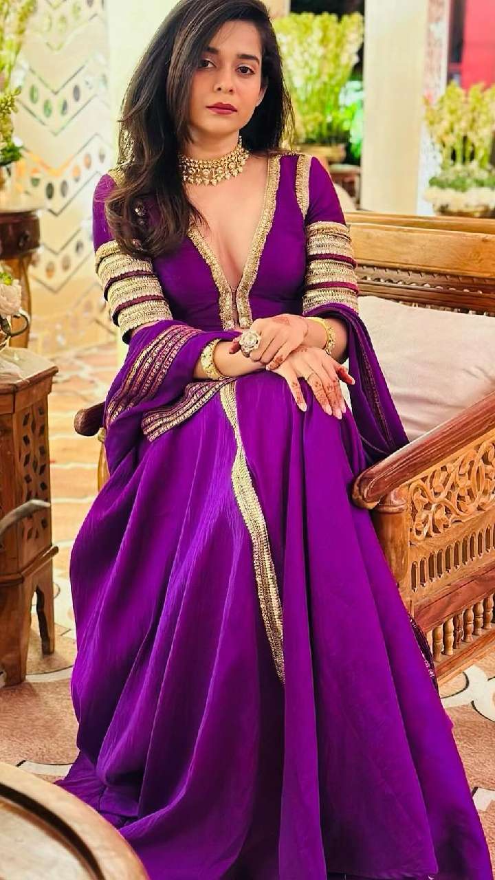 पर्पल कलर के डीप नेक सूट में मिथिला पालकर का लुक हॉट लग रहा है। एक्ट्रेस का सूट प्लेन हैं और गोल्डन लेस से बॉर्डर लगाई गई है।
