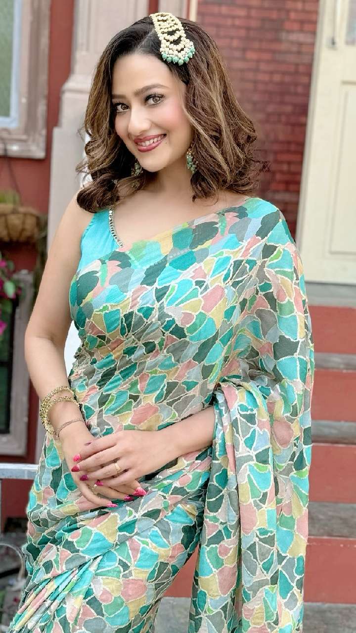 ग्रीन कलर के ग्लिटर साड़ी में मदालसा स्टनिंग लग रही हैं। आप भी इस तरह की साड़ी को अपने वॉडरोब में शामिल कर लें।