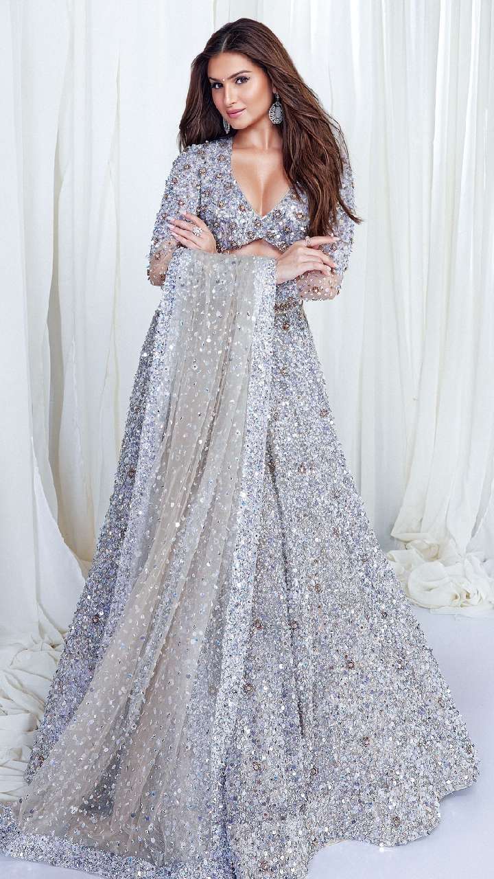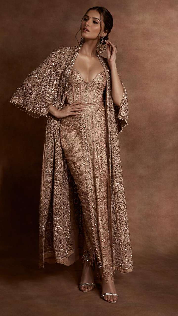 एक्ट्रेस ने हैवी वर्क वाली धोती स्टाइल की स्कर्ट के साथ कोर्सेट टॉप और श्रृग के साथ कैरी किया हुआ है। आप इस लुक को न्यूड मेकअप के साथ स्टाइल कर सकती हैं।