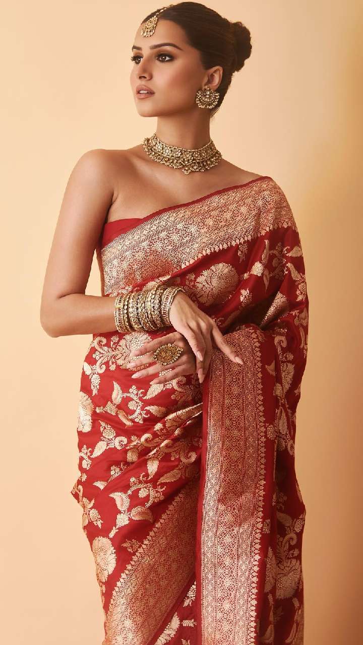 लाल कलर की साड़ी में एक्ट्रेस कमाल की लग रही हैं। उनका ट्यूब ब्लाउज साड़ी में चार चार चांद लगा रहा है। आप मिनिमम ज्वेलरी और कर्ली हेयर स्टाइल के साथ साड़ी को वियर कर सकती हैं।
