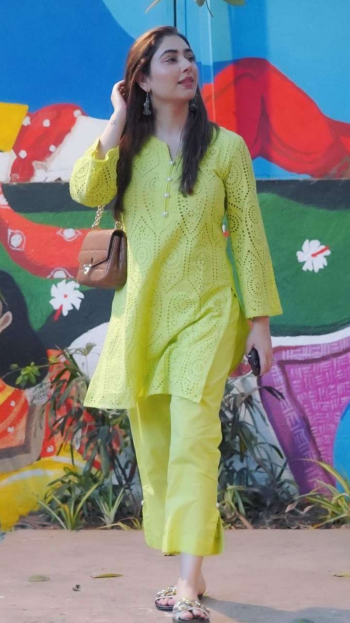 एक्ट्रेस का ये लाइट ग्रीन पेंट सूट भी काफी एलिगेंट लुक दे रहा है।