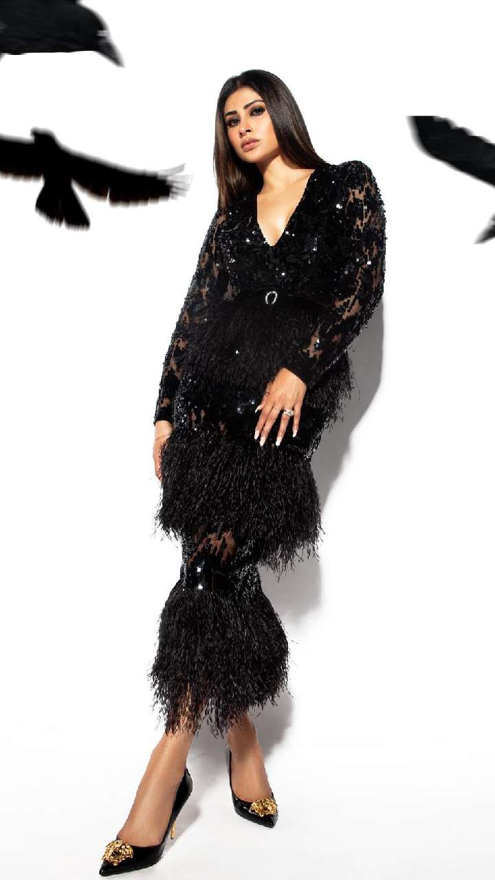 मौनी का इस तस्वीर में ब्लैक इन व्हाइट शार्ट ड्रेस में हॉट अंदाज देखा जा सकता है। इसके साथ उन्होंने ब्लैक हील्स और बोल्ड मेकअप से अपना लुक कंप्लीट किया है।