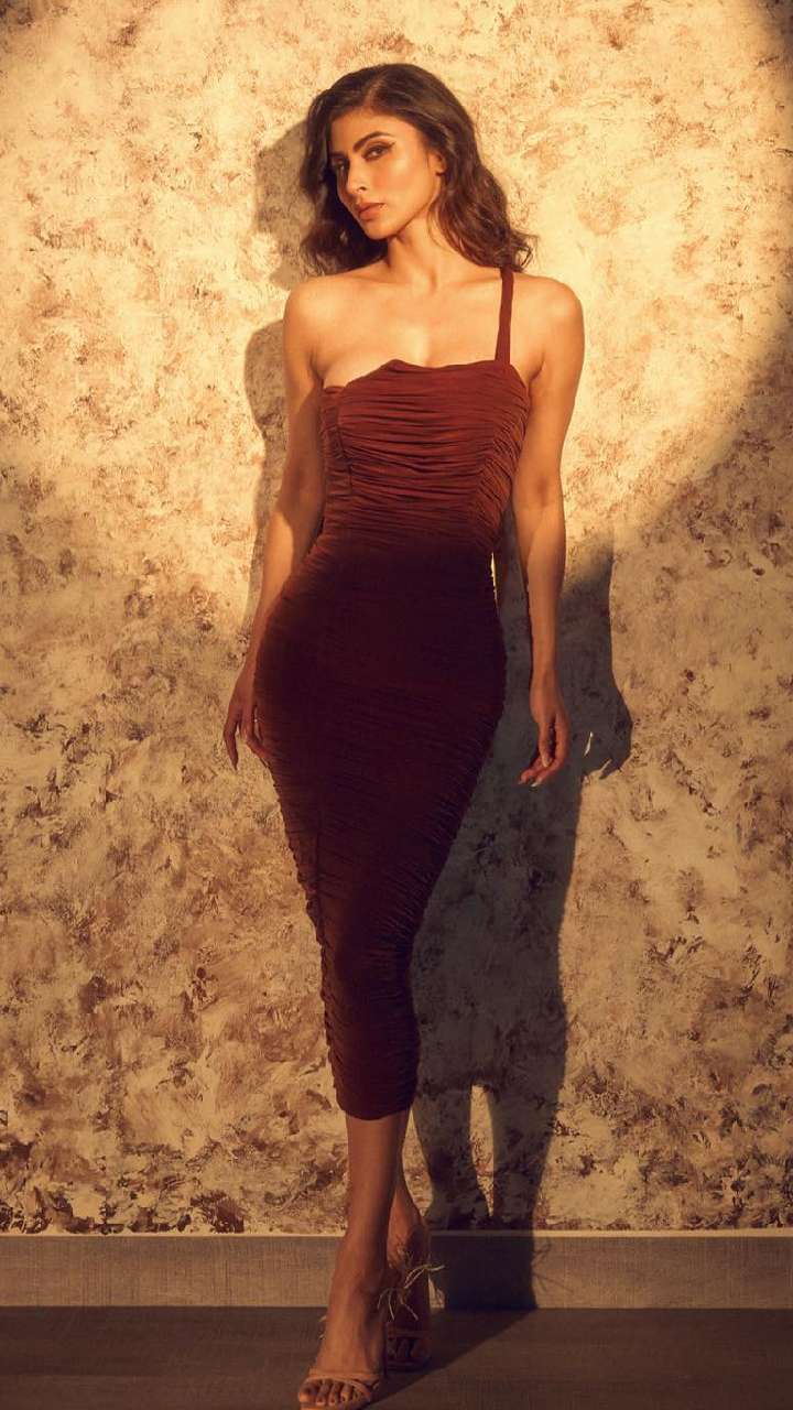 मौनी रॉय इस लाइट कलर की साटन ट्यूब ड्रेस में अपने सिजलिंग लुक से इंटरनेट का पारा बढ़ा रही हैं।