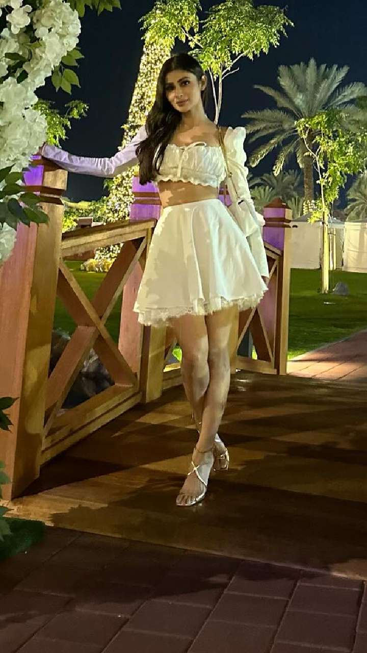इस व्हाइट कलर के स्कर्ट-टॉप में मौनी ने न्यू ईयर के मौके पर अपने स्टाइलिश अंदाज का जलवा बिखेरा था।
