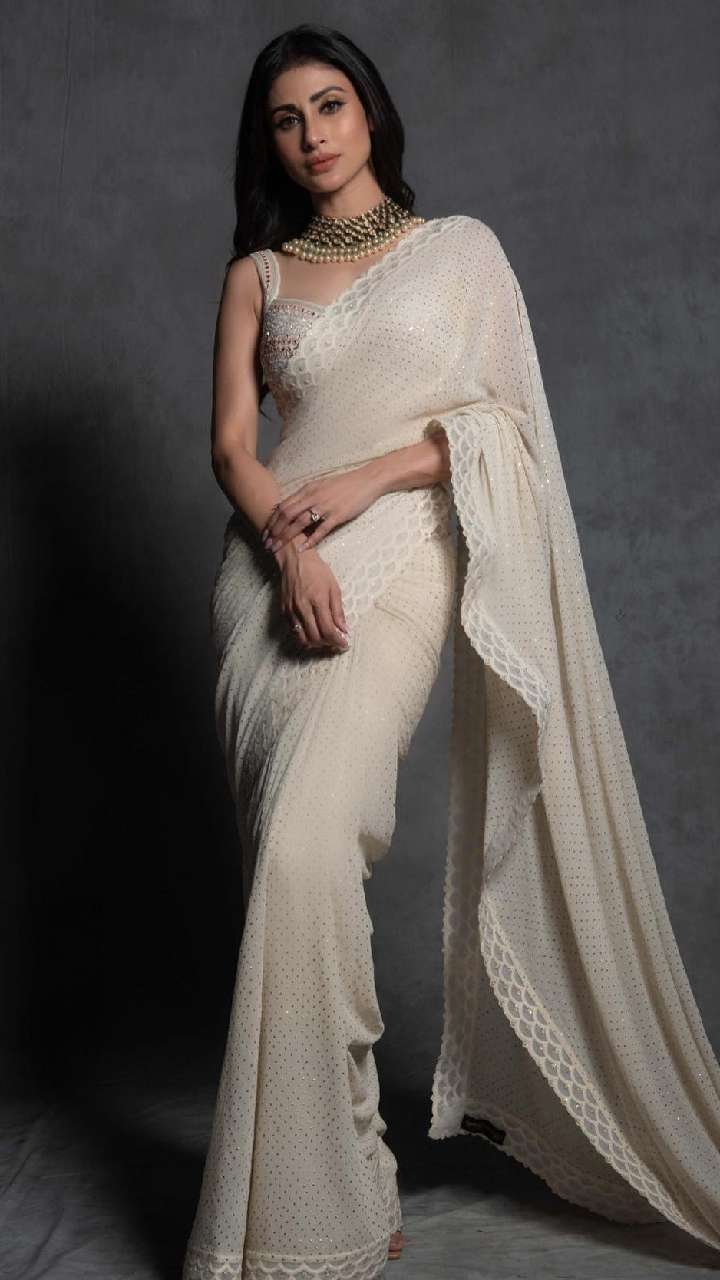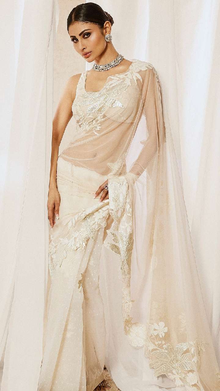 मौनी आइवरी कलर की साड़ी में बेहद खूबसूरत लग रही हैं। साड़ी के साथ उन्होंने प्लंजिंग नेकलाइन ब्लाउज कैरी किया है, जो लुक पर चार चांद लगा रहा है। आप भी उनके इस लुक को कॉपी करें।