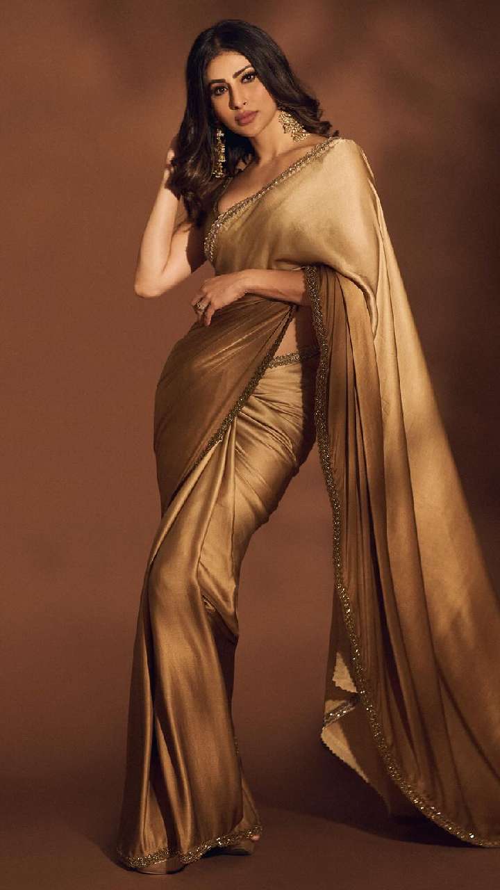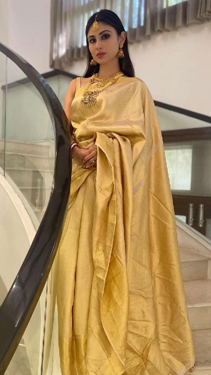 साड़ी में रॉयल लुक पाना चाहती हैं, तो मौनी के इस लुक को ट्राई करना न भूलें। गोल्डन कलर की सिल्क साड़ी में एक्ट्रेस बेहद खूबसूरत लग रही हैं। आप भी ऐसी साड़ी से आइडिया ले सकती हैं।