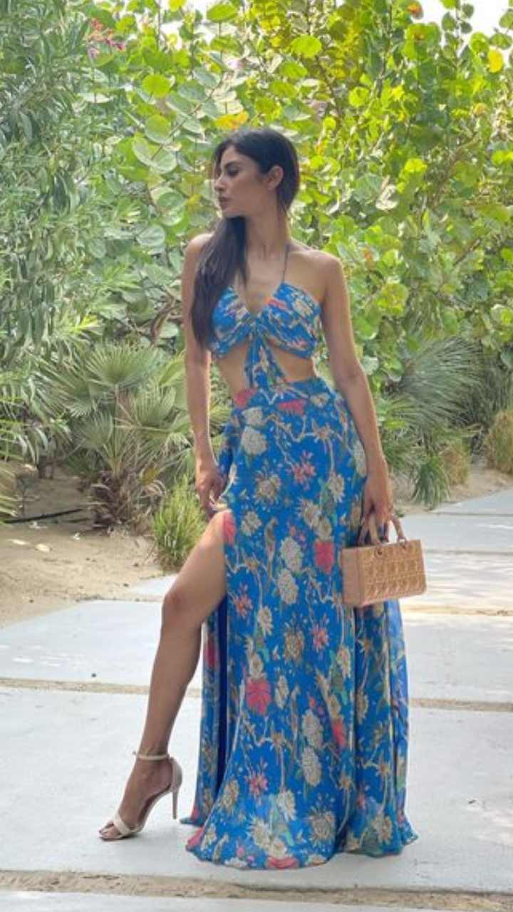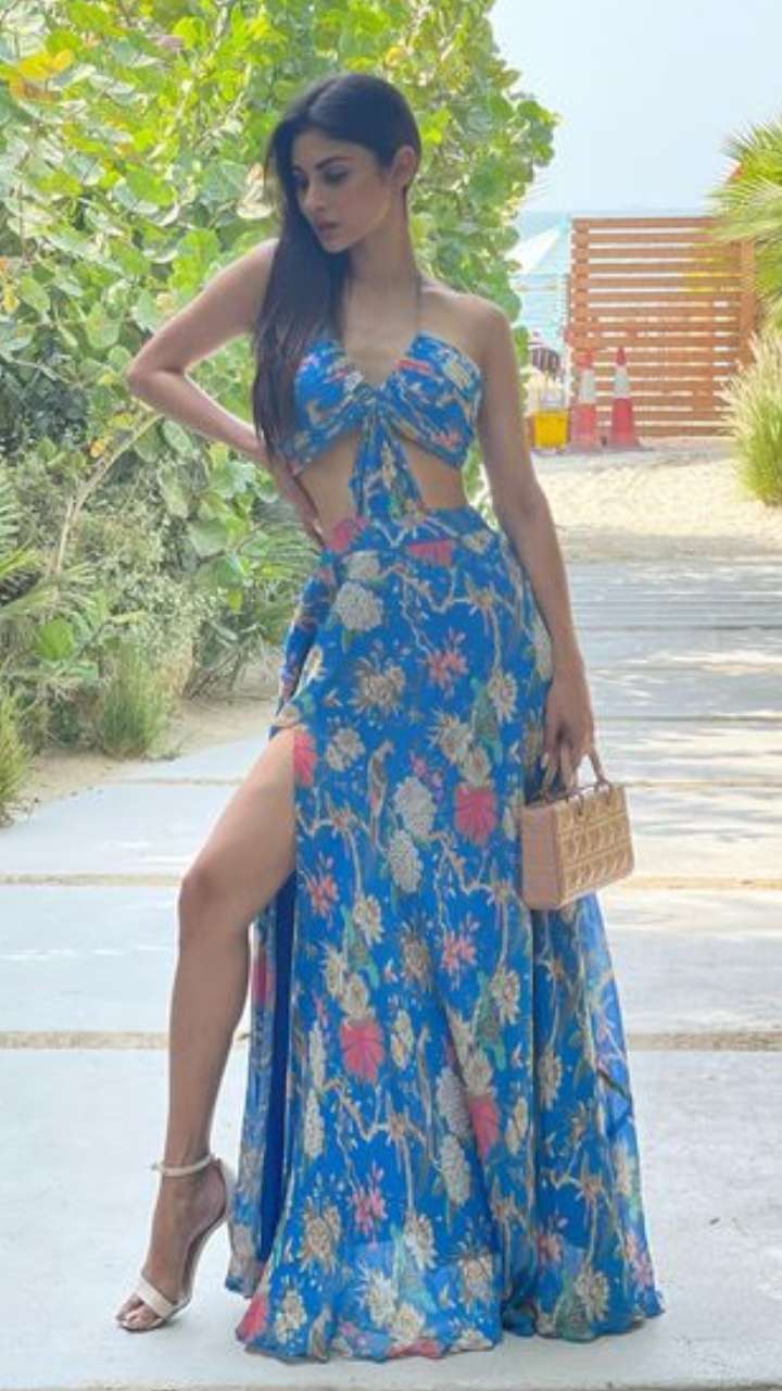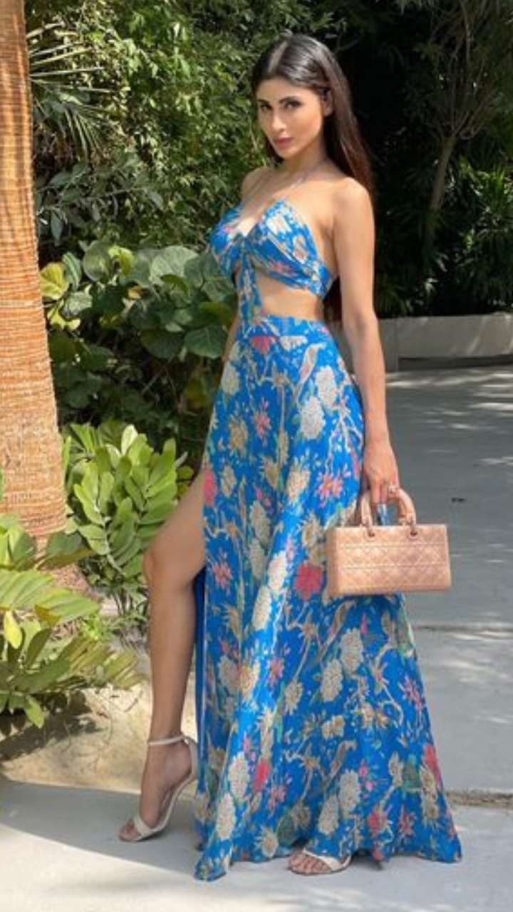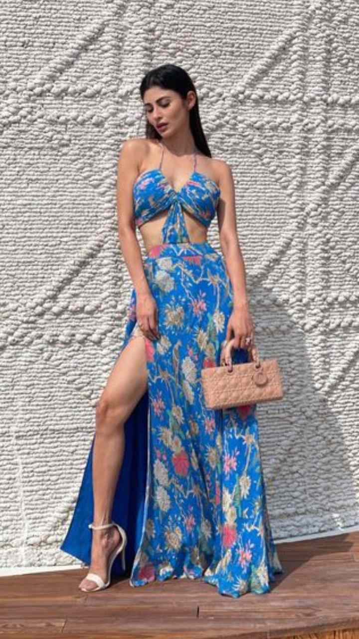 मौनी रॉय ब्लू कलर की थाई हाई स्लिट ड्रेस में बेहद बोल्ड नजर आ रही हैं।
