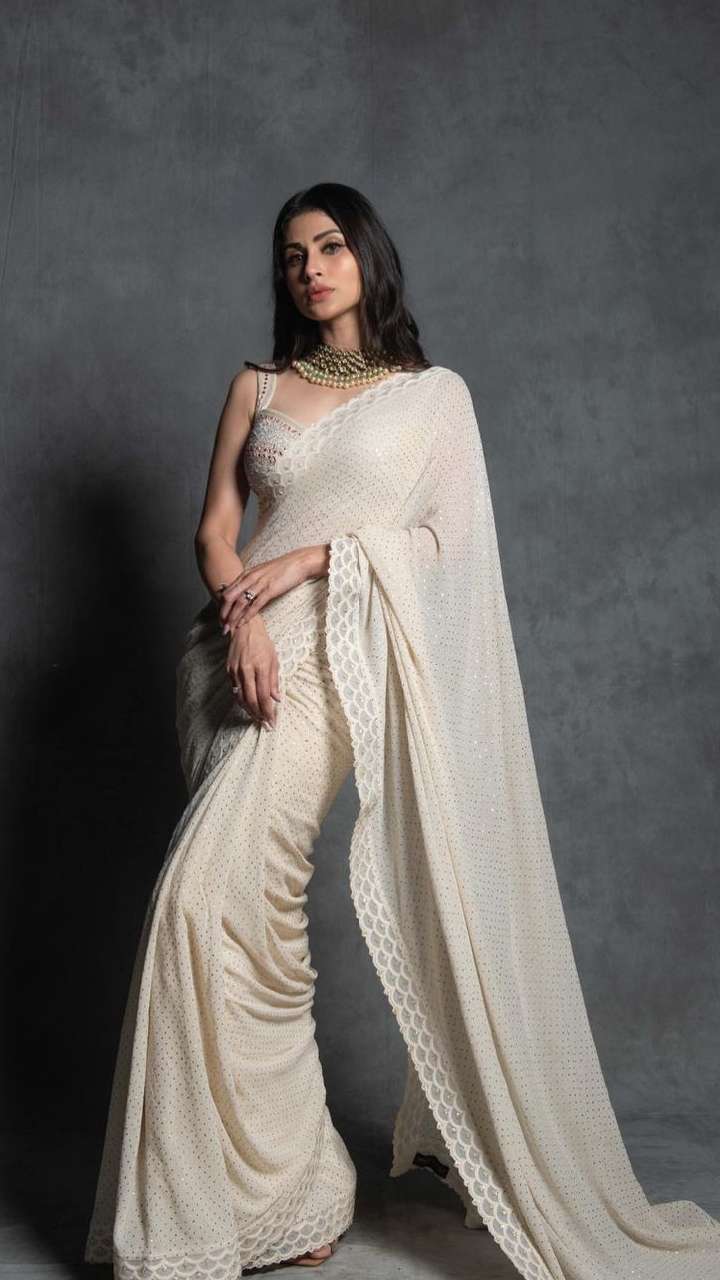 व्हाइट कलर की प्लेन साड़ी में एम्ब्रॉयडरी की गई है। इस साड़ी लुक के साथ मौनी रॉय ने गले में गोल्ड नेकलेस कैरी किया है।