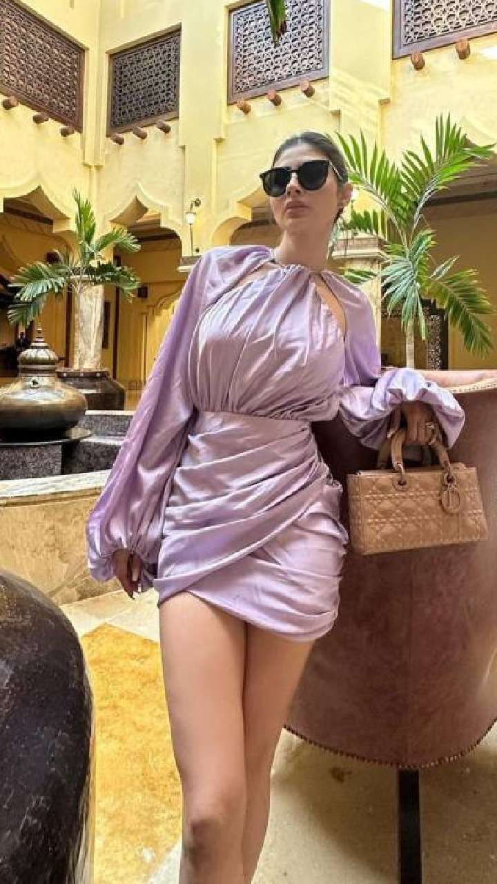लेटेस्ट फोटोज में पर्पल कलर की मिनी ड्रेस कैरी की है और शू से लुक को कंप्लीट किया है।