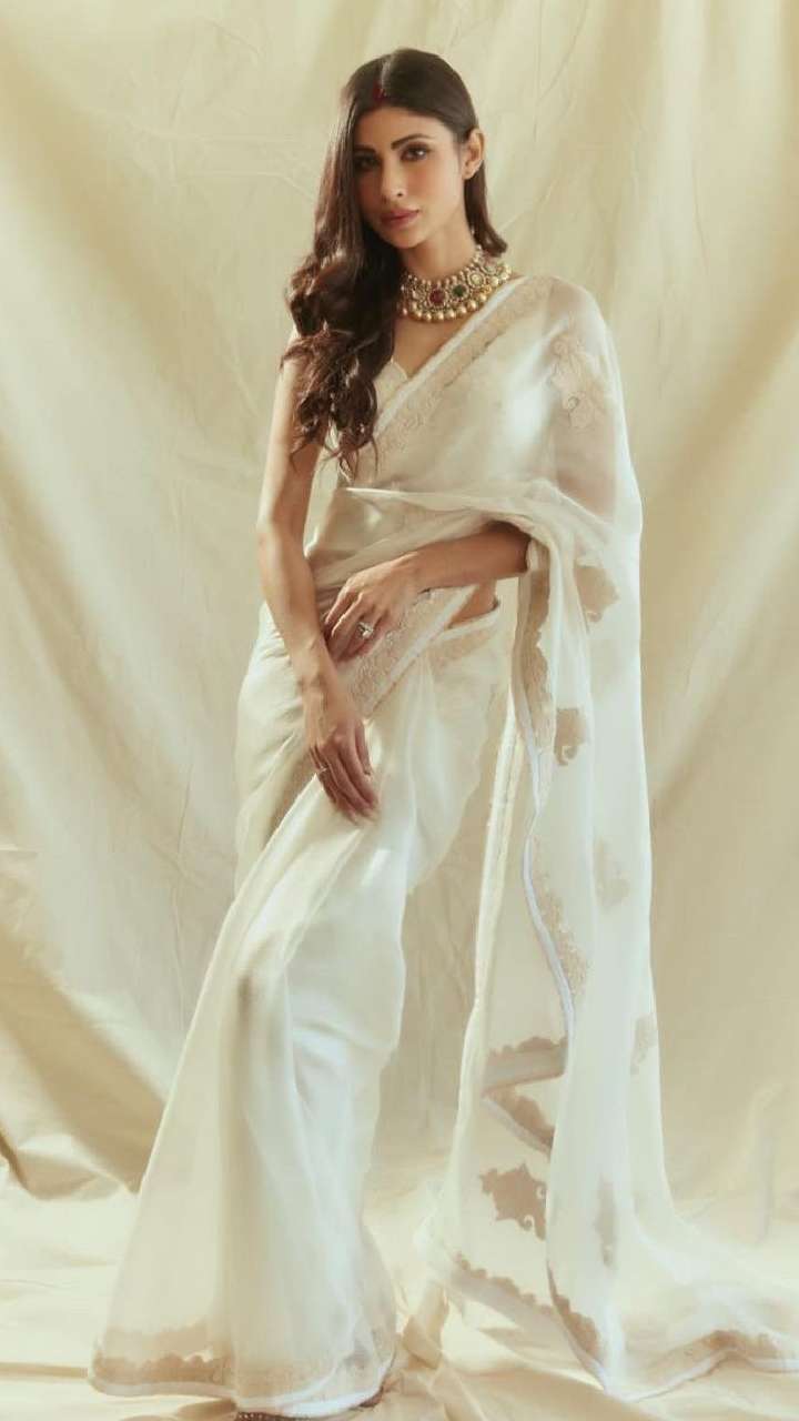 समर में मौनी का ये व्हाइट कॉटन साड़ी लुक बेस्ट रहेगा।