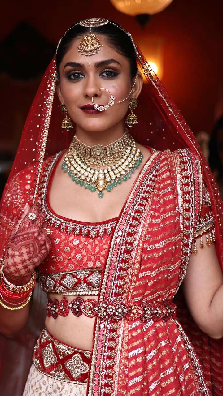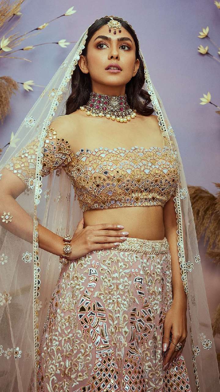 मृणाल का मिरर वर्क लहंगा लुक काफी प्रिटी लग रहा है। इसके साथ उनकी ऑफ शोल्डर चोली हेवी नेकपीस उनके लुक में चार चांद लगा रहा है।