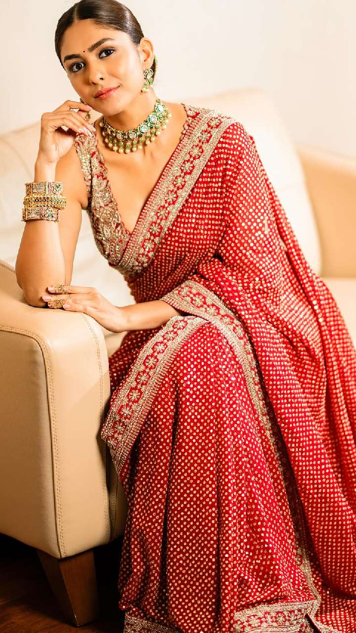 इस रेड कलर की डॉट प्रिंट साड़ी बालों में गजरा बन हेयर स्टाइल में मृणाल बला की खूबसूरत लग रही हैं।
