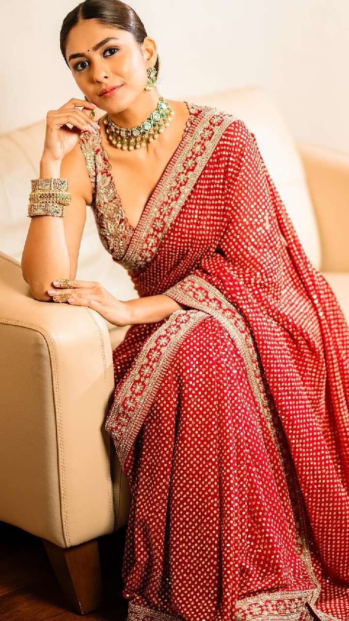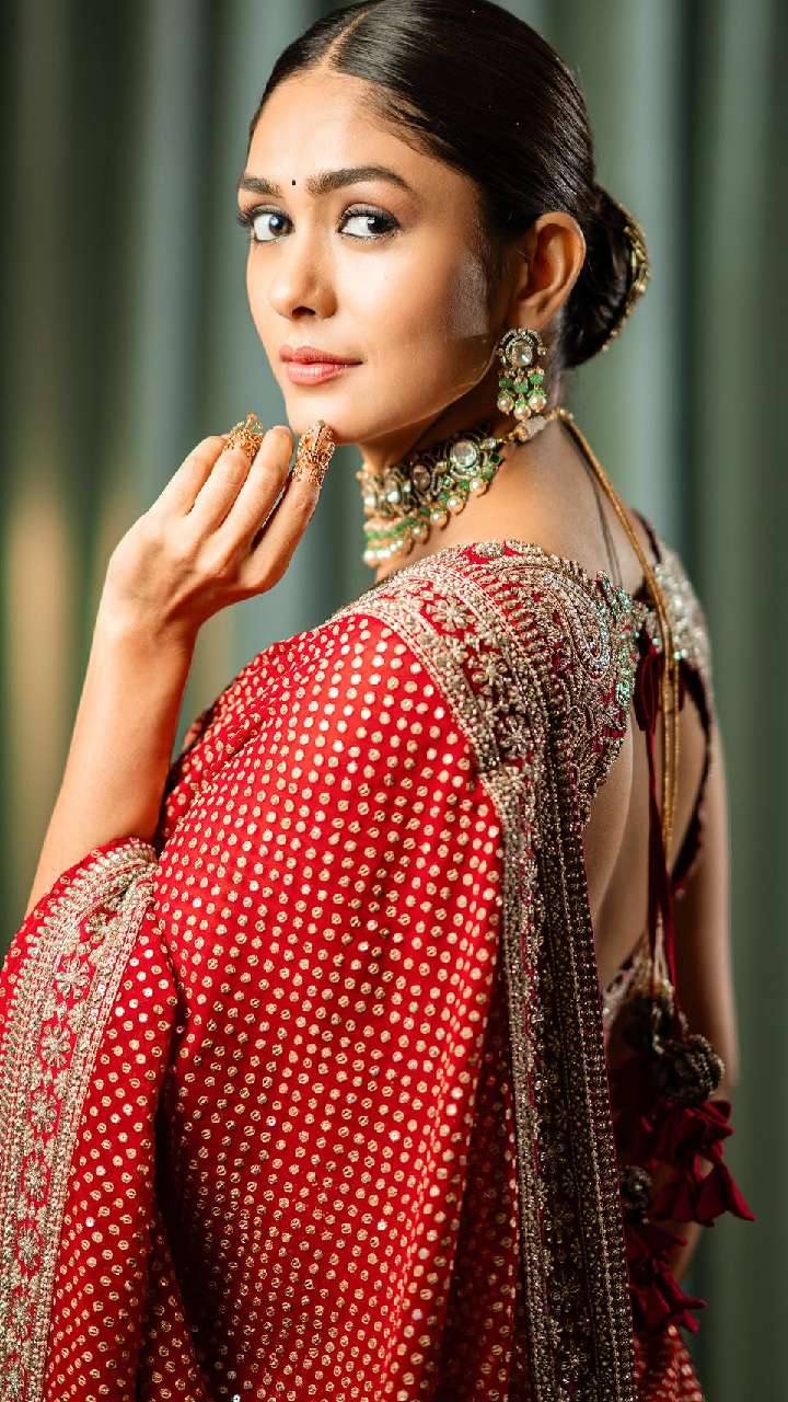 मृणाल ठाकुर ने इंस्टाग्राम पर रेड साड़ी पर्ल हेवी नेकपीस इयररिंग बन हेयर स्टाइल में अपना गॉर्जियस लुक शेयर किया है। साथ में उनका ग्लॉसी मेकअप लुक बेस्ट है।