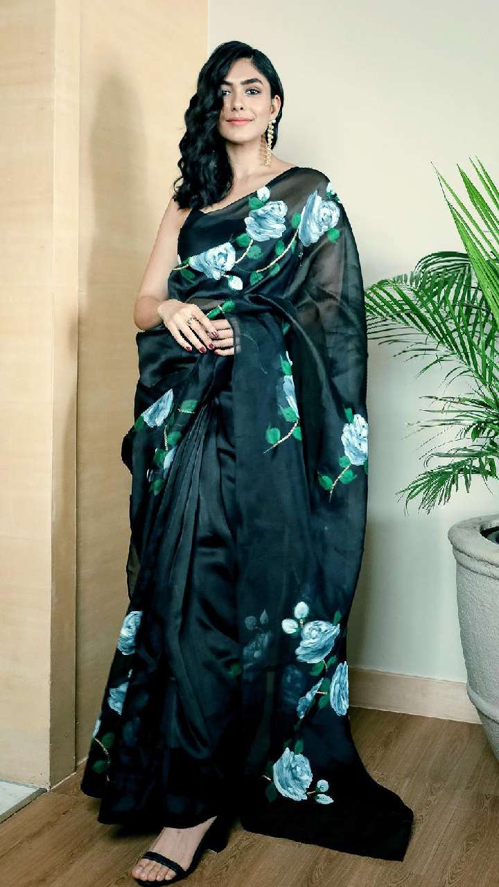 यदि कुछ सिंपल और डिफरेंट ट्राई करने का सोच रही हैं। तो मृणाल की स्काई ब्लू ऑर्गेंजा साड़ी जीरो नेक ब्लाउज लाइट मेकअप ट्राई कर सकती हैं।