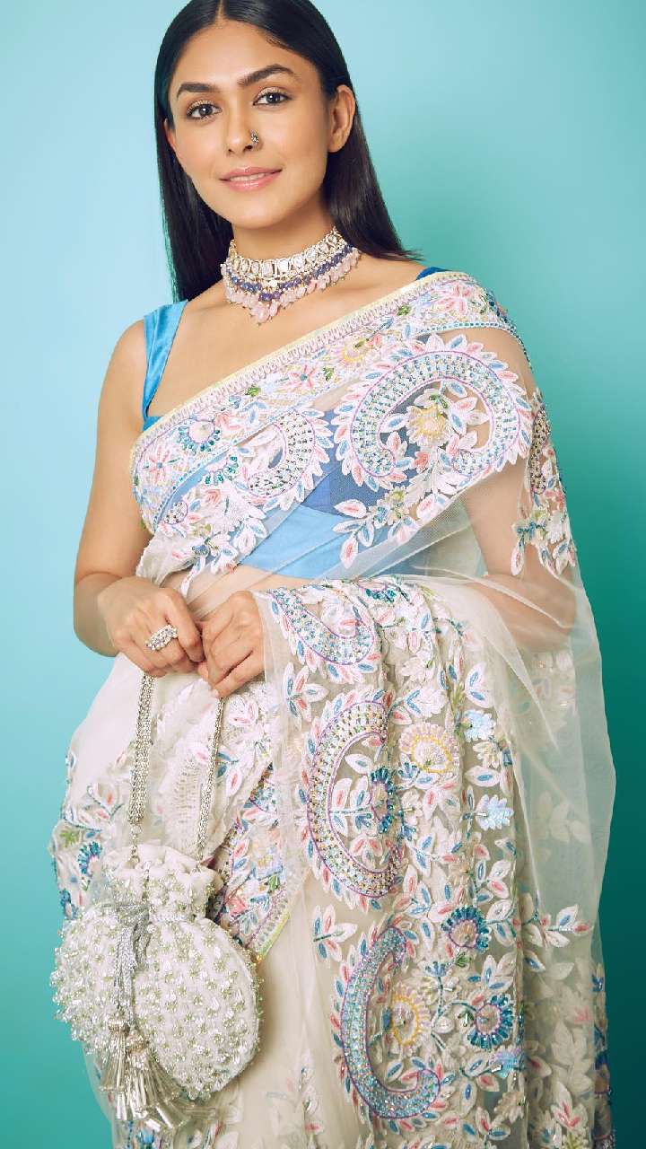 शादी सीजन के लिए मृणाल का ब्लू व्हाइट नेटिड साड़ी मैचिंग बीड्स नेकपीस लुक परफेक्ट रहेगा। इस लाइट कलर साड़ी के साथ डीवा का मिनिमल मेकअप जंच रहा है।