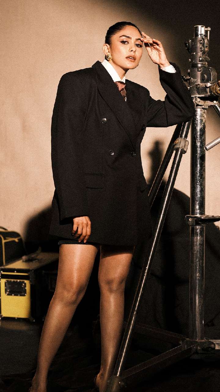 मृणाल ब्लैक ब्लेजर सेट में बॉसी नजर आ रही हैं। इस तरह के आउटफिट ऑफिस के लिए परफेक्ट है।