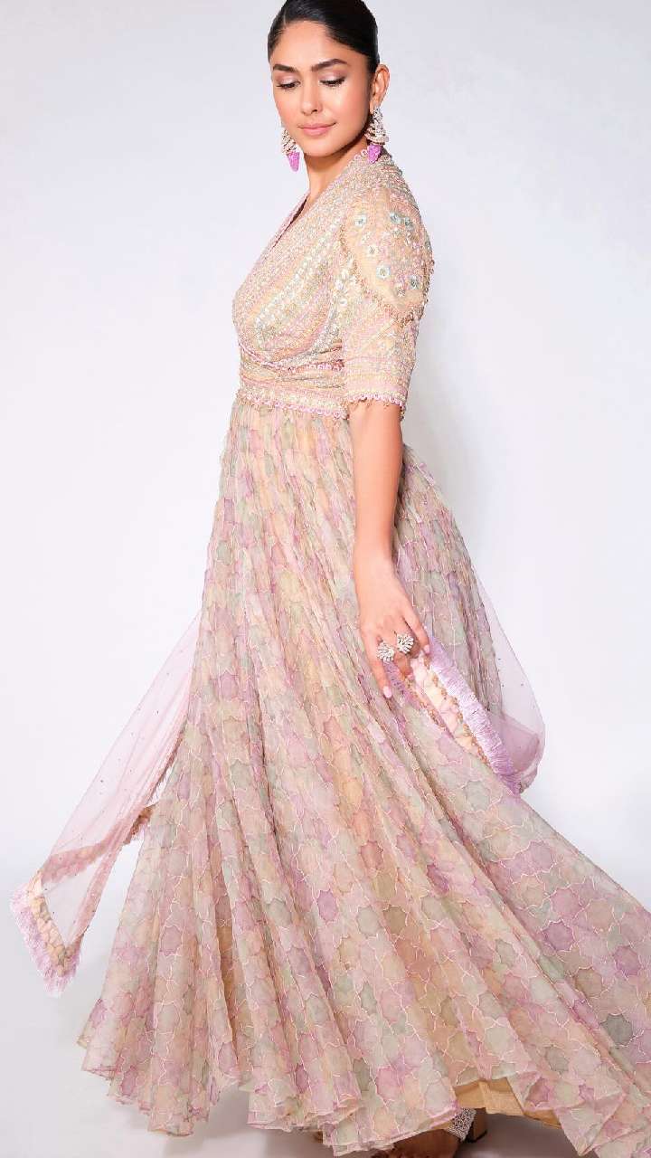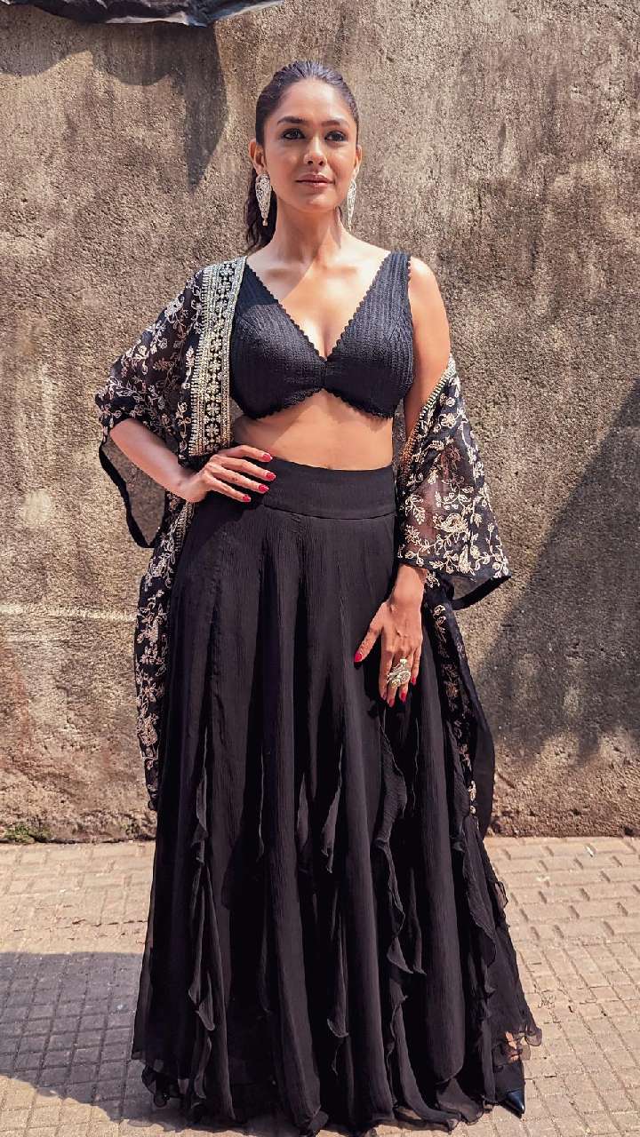 इन दिनों इंडो-वेस्टर्न ड्रेस काफी ट्रेंड में हैं। ऐसे में मृणाल का ब्लू रफल स्कर्ट, वी नेक चोली और प्रिंटेड श्रग लुक रिसेप्शन के लिए बेस्ट है।