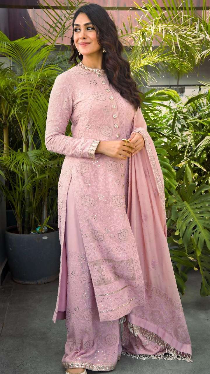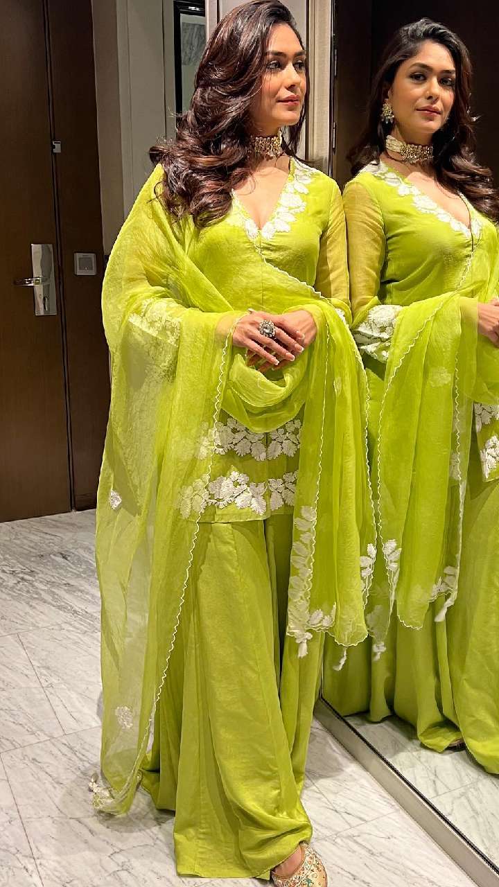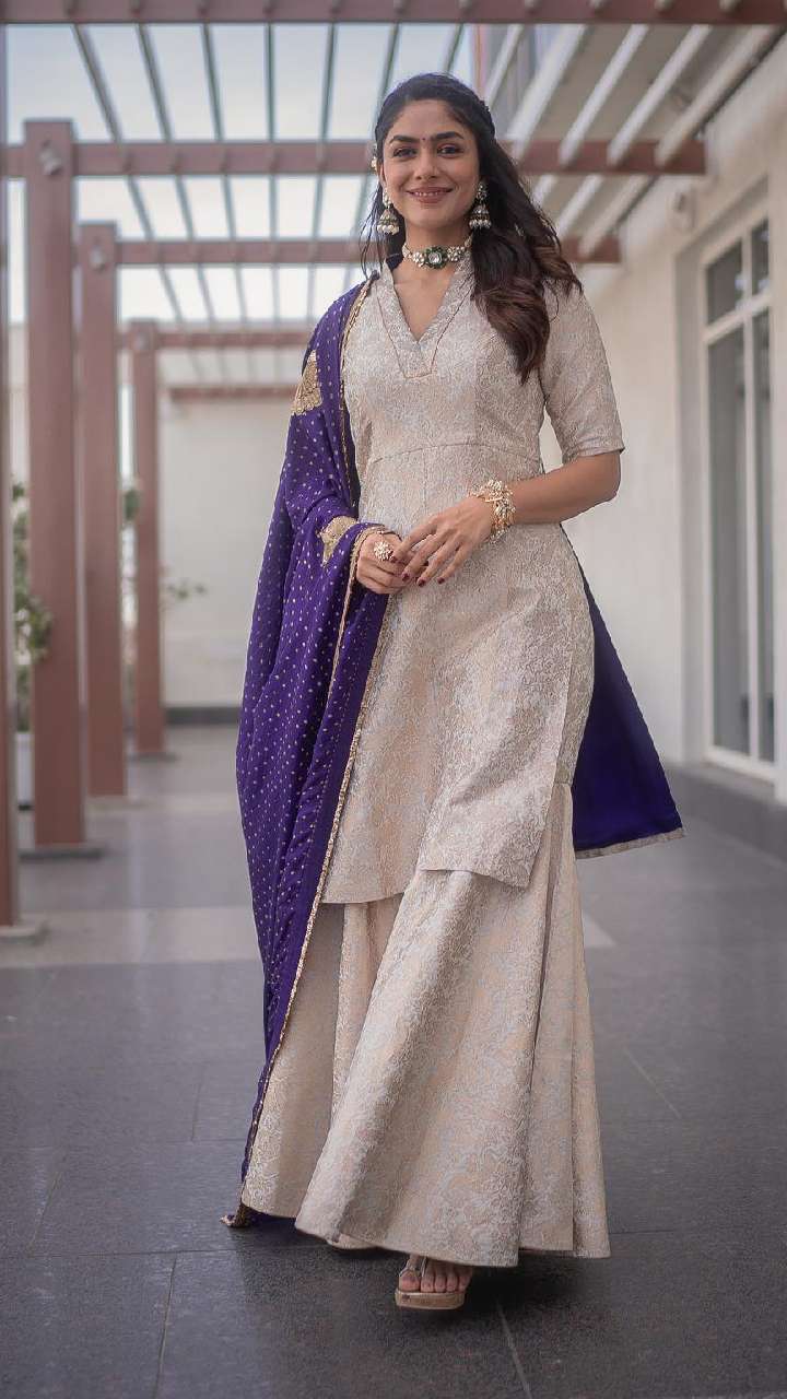 मृणाल इस बनारसी शरारा सूट में काफी ब्यूटीफुल लग रही हैं। जिसे आप ईद पर ट्राई कर सकती हैं।