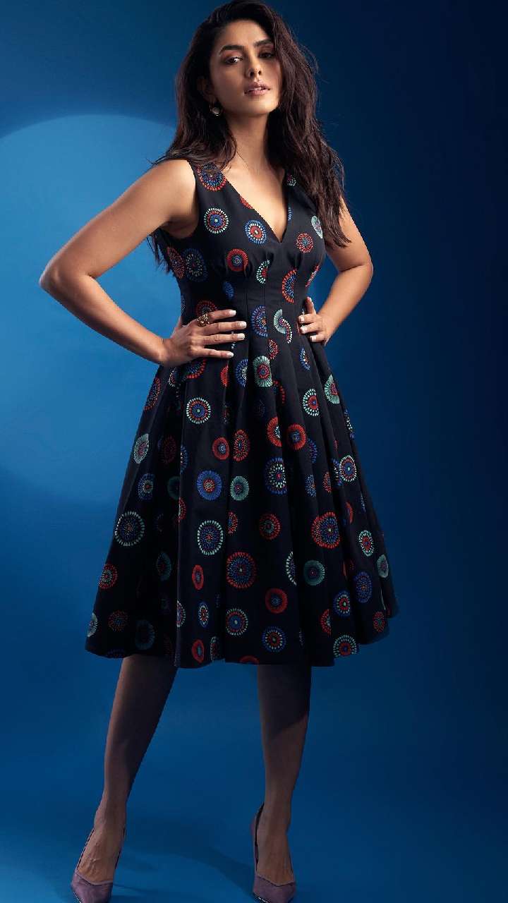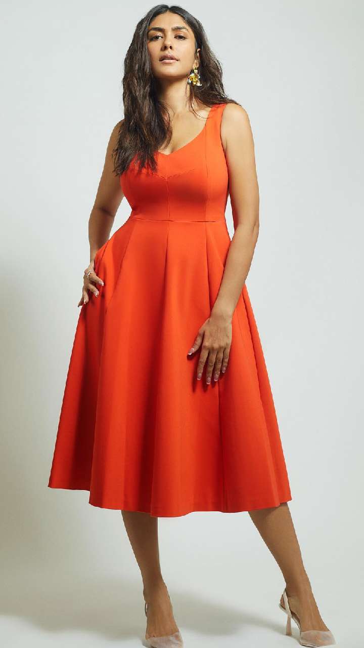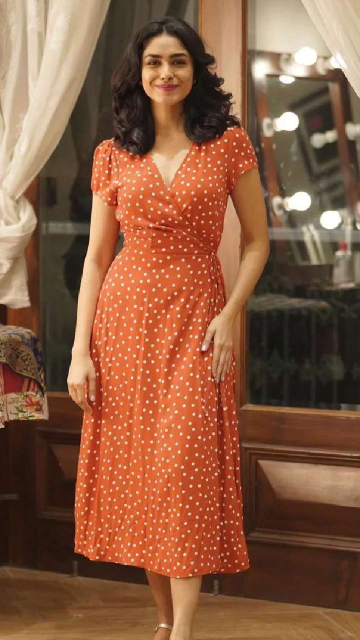 ऑरेंज कलर की पोल्का डॉट ड्रेस में मृणाल का क्यूट लुक देख कोई भी उनपर फिदा हो जाएगा। आप भी इसे अपना लुक बनाकर स्मार्ट दिख सकती हैं।