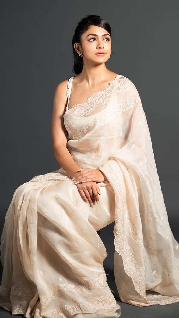 मृणाल का ये ऑफ व्हाइट साड़ी लुक बेहद एलिगेंट लुक देगा।