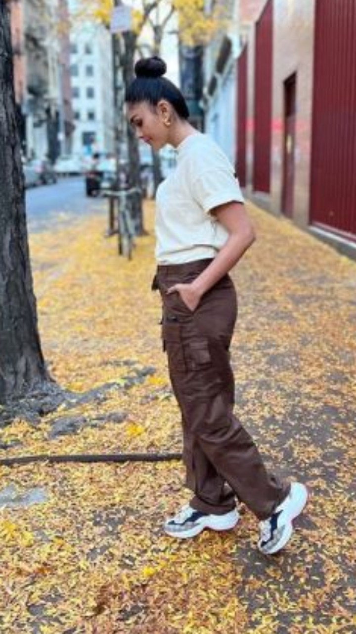 एक्ट्रेस ब्राउन कलर के जॉगर्स संग व्हाइट टी - शर्ट में क्लासी नजर आ रही हैं।