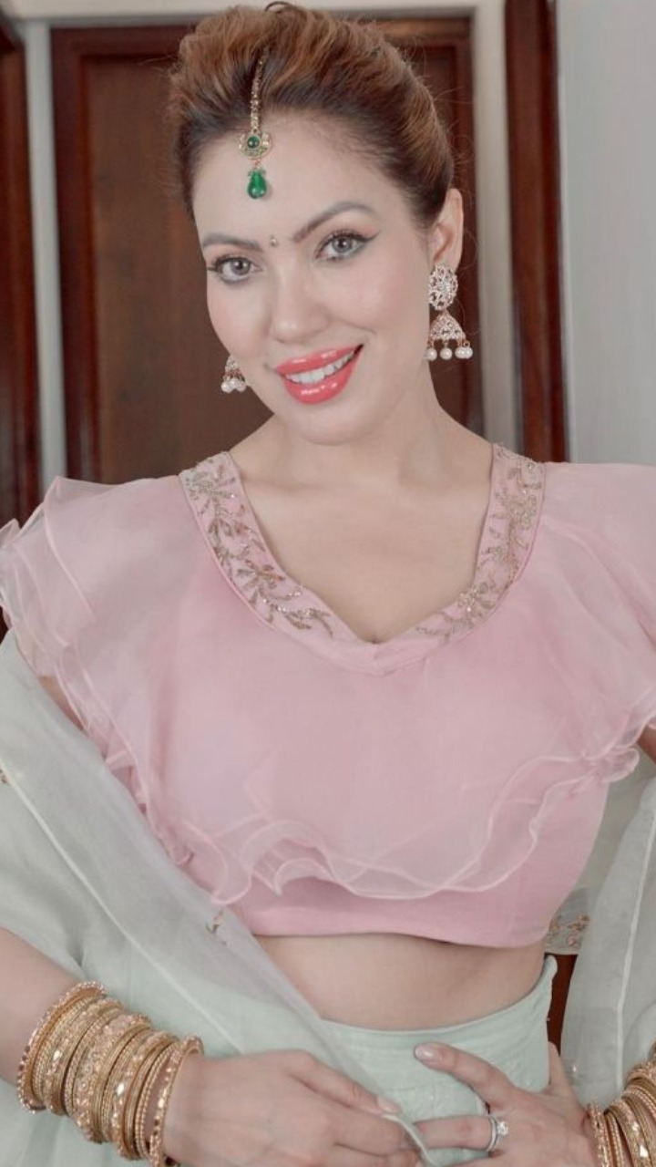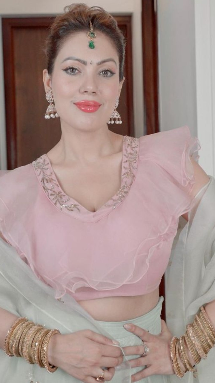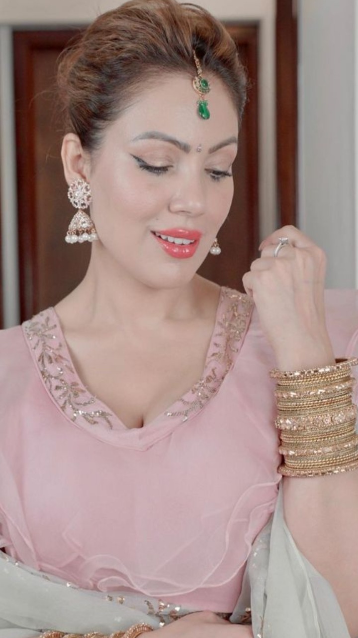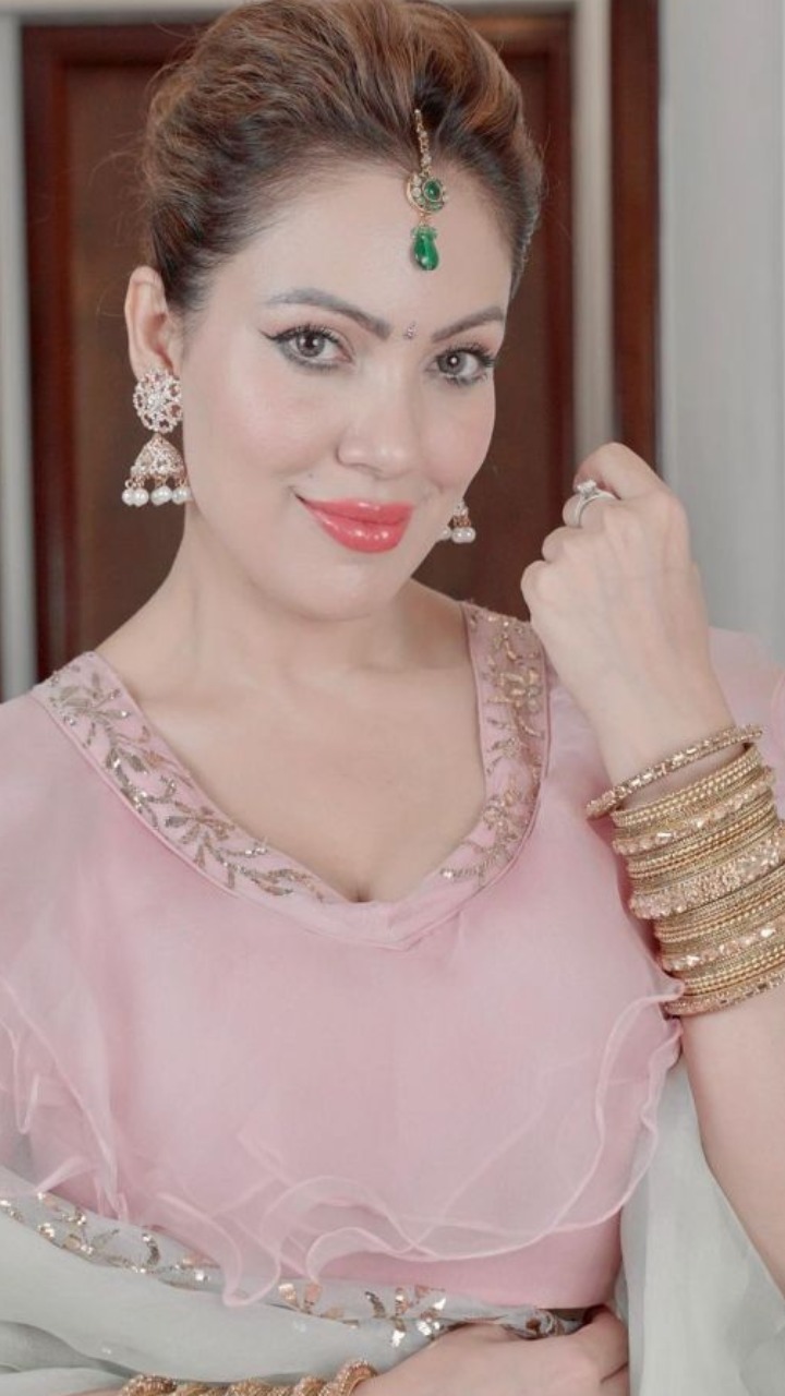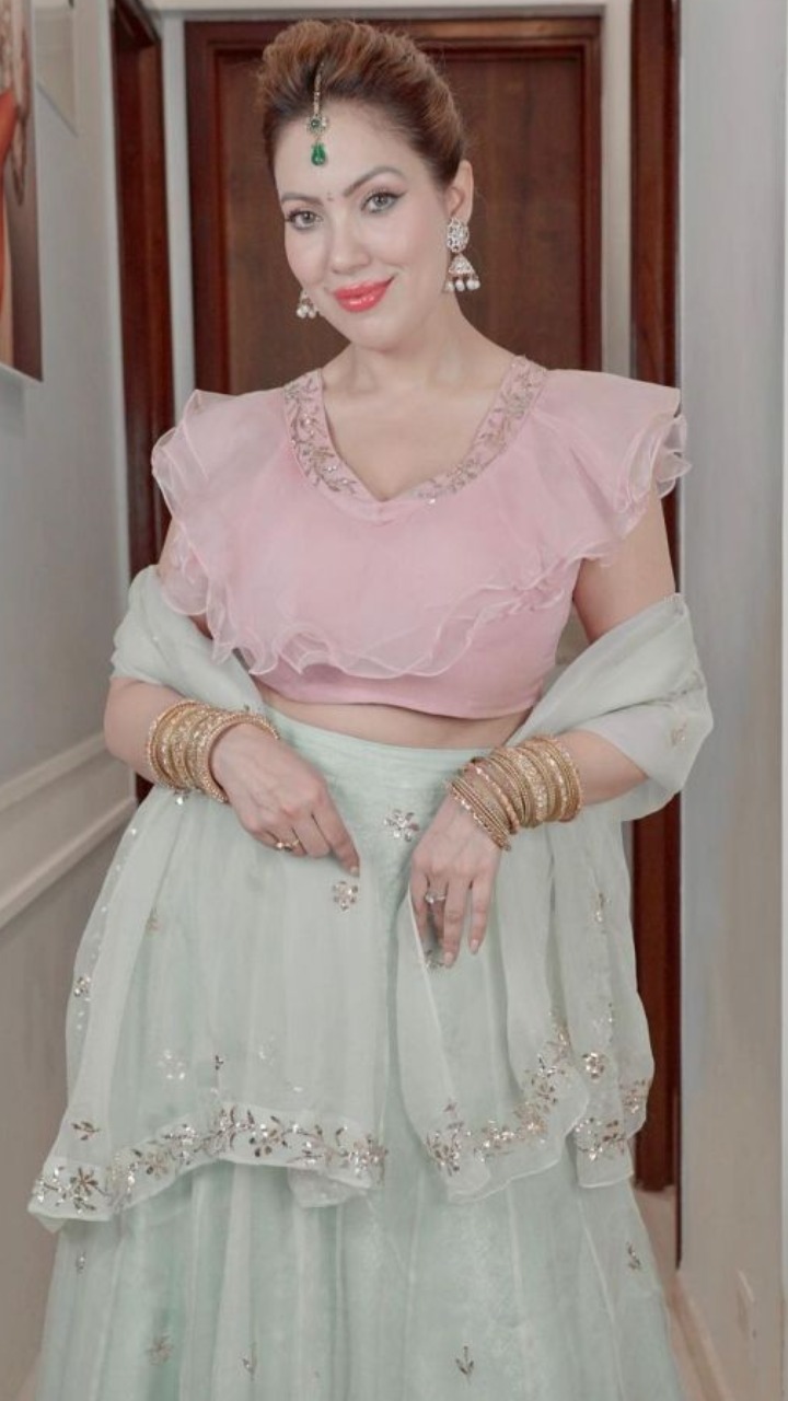 इन तस्वीरों में बबीता जी बेहद खूबसूरत लग रही हैं, उन्होंने लाइट ग्रीन और पिंक कलर के लहंगे संग कुंदन ज्वैलरी कैरी की हुई है। वही उनके हाथों की गोल्डन चूड़ियां उनके लुक में जान डाल रही हैं।
