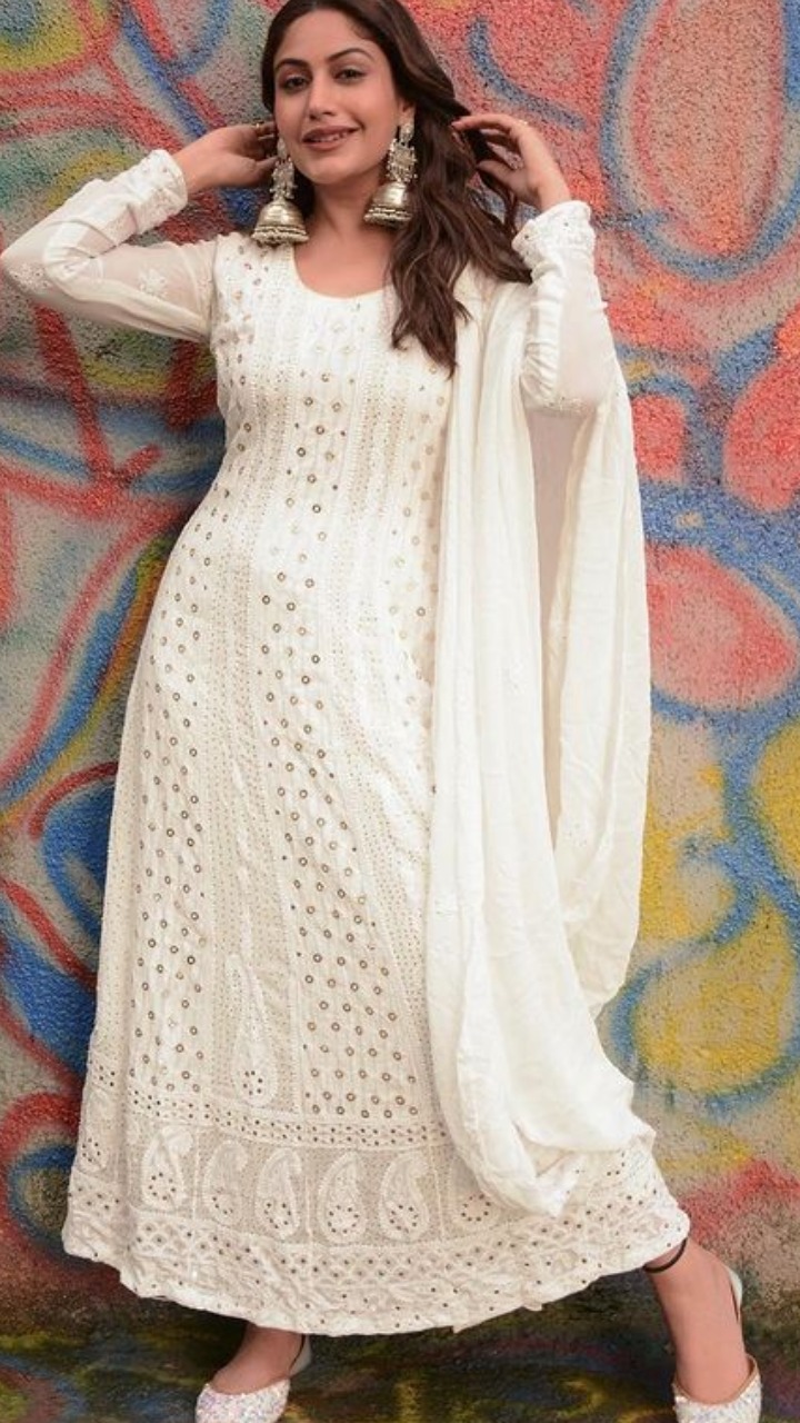 एक्ट्रेस ने सफेद अनारकली सूट संग ओपन कर्ली हेयर और मिनिमल मेकअप कैरी किया है।
