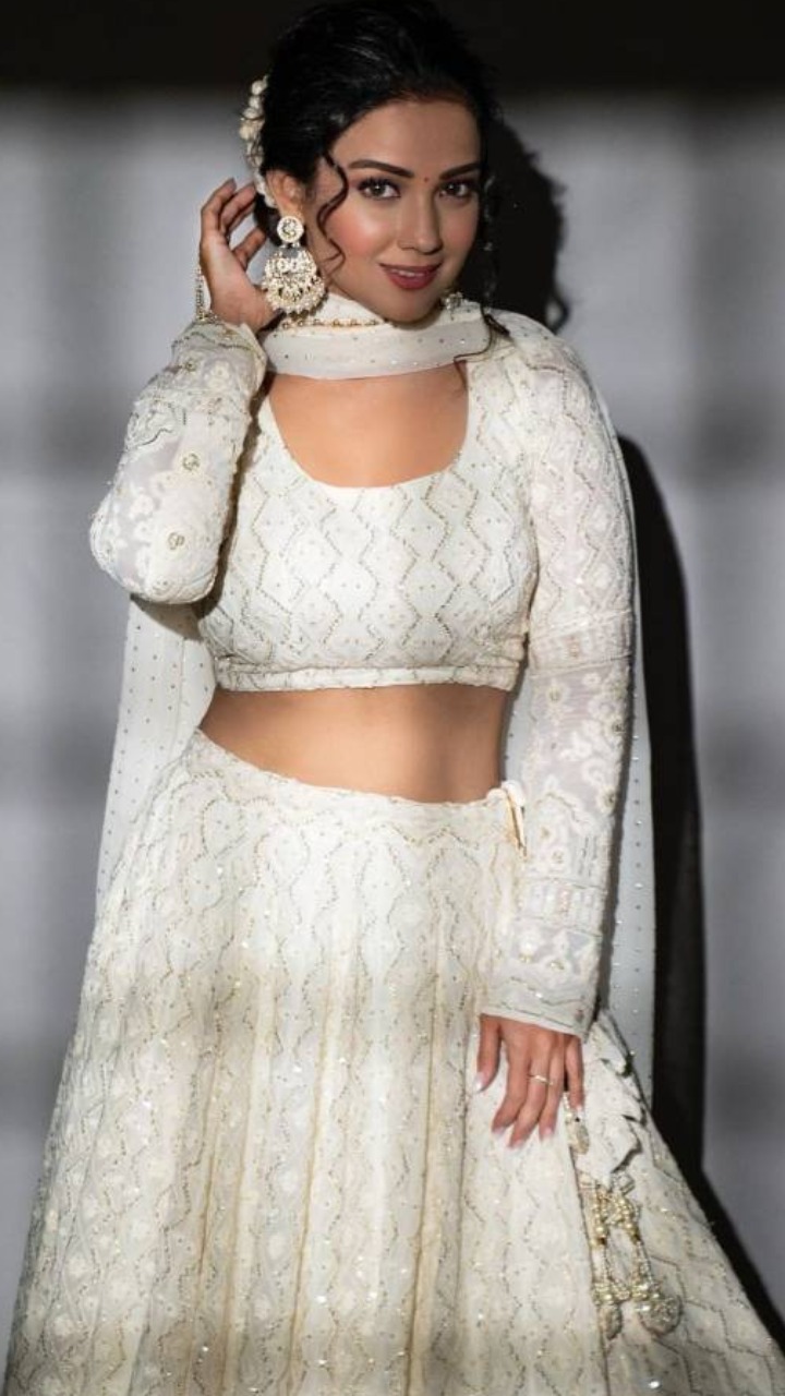 व्हाइट कलर की साड़ी और स्लीवलेस ब्लाउज के साथ कानों में झुमका और हाथों में मैचिंग बैंड अदा के लुक में चार चांद लगाने का काम कर रहे हैं।